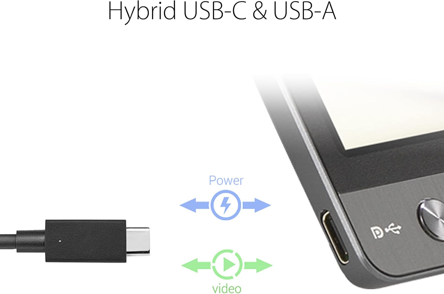 Основна перевага — універсальний інтерфейс USB-C, який одночасно передає живлення та відео, не потребуючи окремого блока живлення. Це дозволяє використовувати монітор із ноутбуками, смартфонами, планшетами та навіть ігровими консолями. Підтримується також USB-A (через перехідник, не в комплекті).