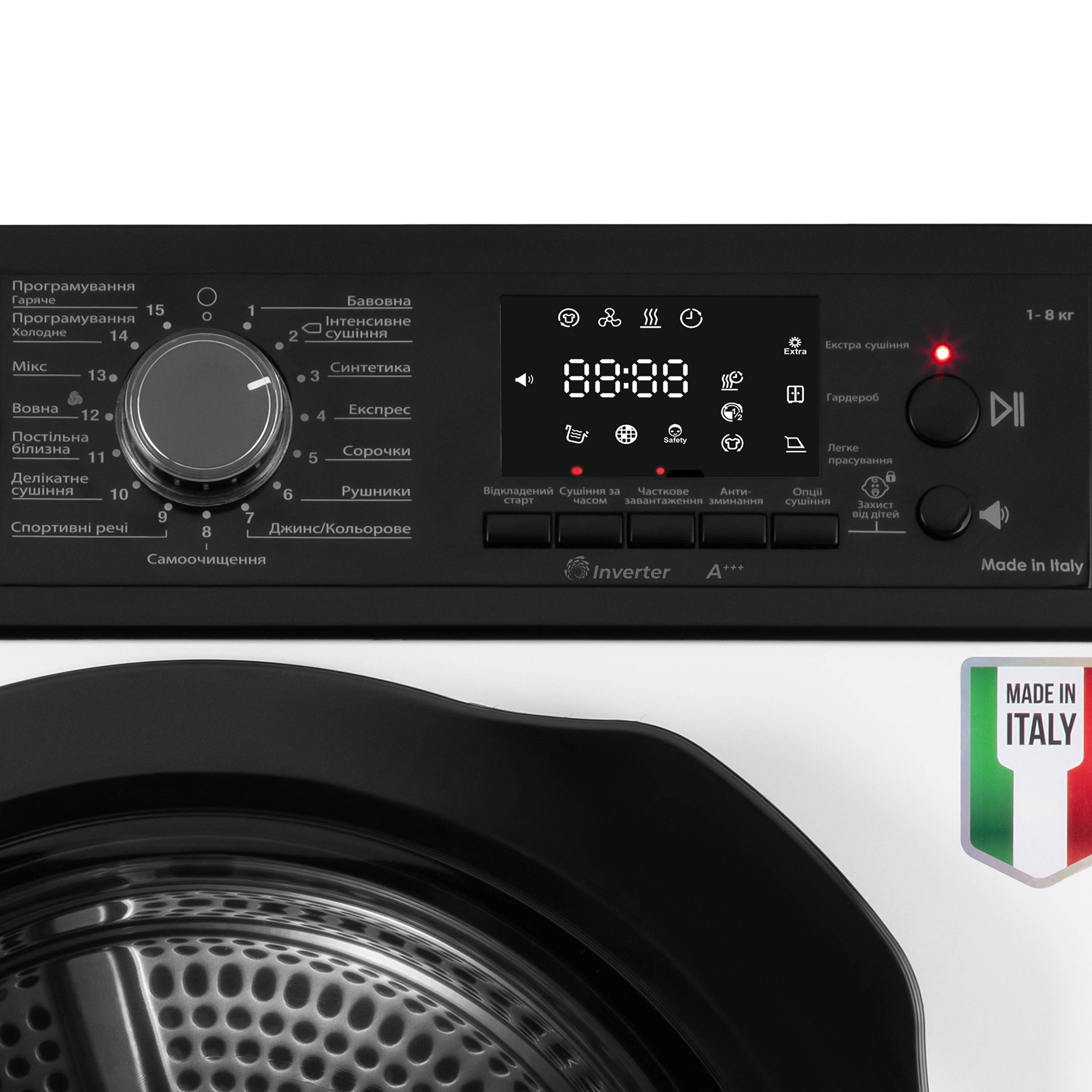 Серце моделі – PSC-двигун – забезпечує надійність і тривалий термін слугування, тоді як електронне керування із цифровим дисплеєм не просто зумовлює комфорт під час користування, а і додає часточку магії в повсякденні моменти, роблячи процес сушіння зрозумілим і зручним як ніколи. Можна налаштувати час сушіння з огляду на власні потреби завдяки функції відкладеного старту (1-24 год), а реверсивне обертання та функція часткового завантаження забезпечують рівномірне сушіння та запобігають заплутуванню білизни.