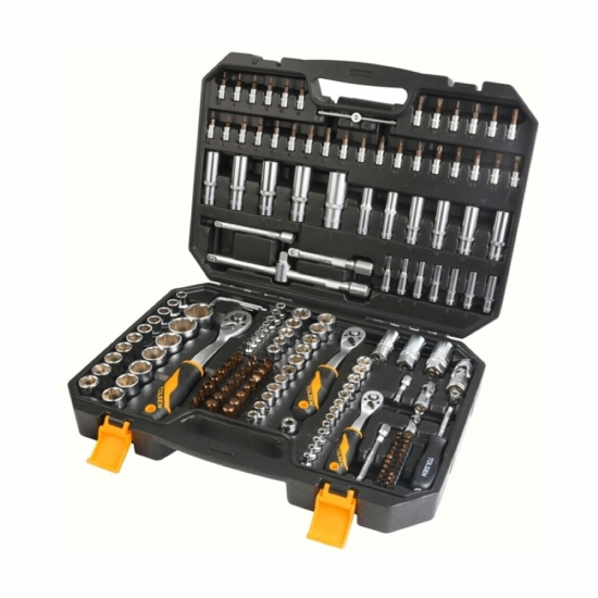 - Включає 3 тріскачки з храповим механізмом (1/4", 3/8", 1/2") для роботи з різними розмірами головок