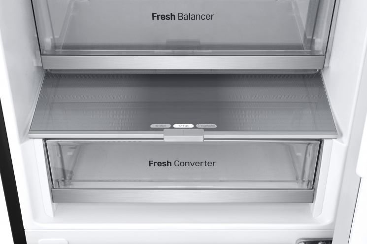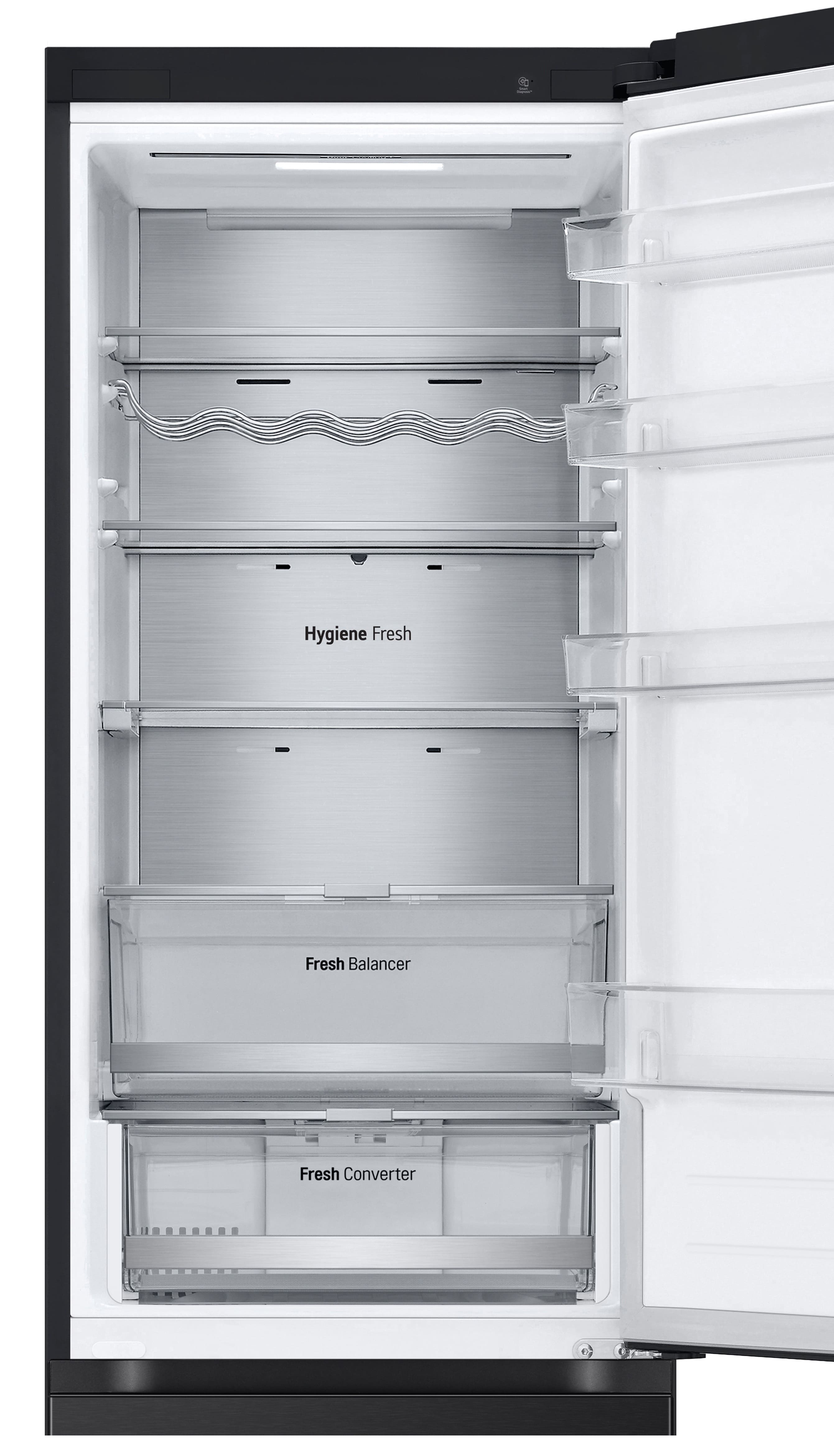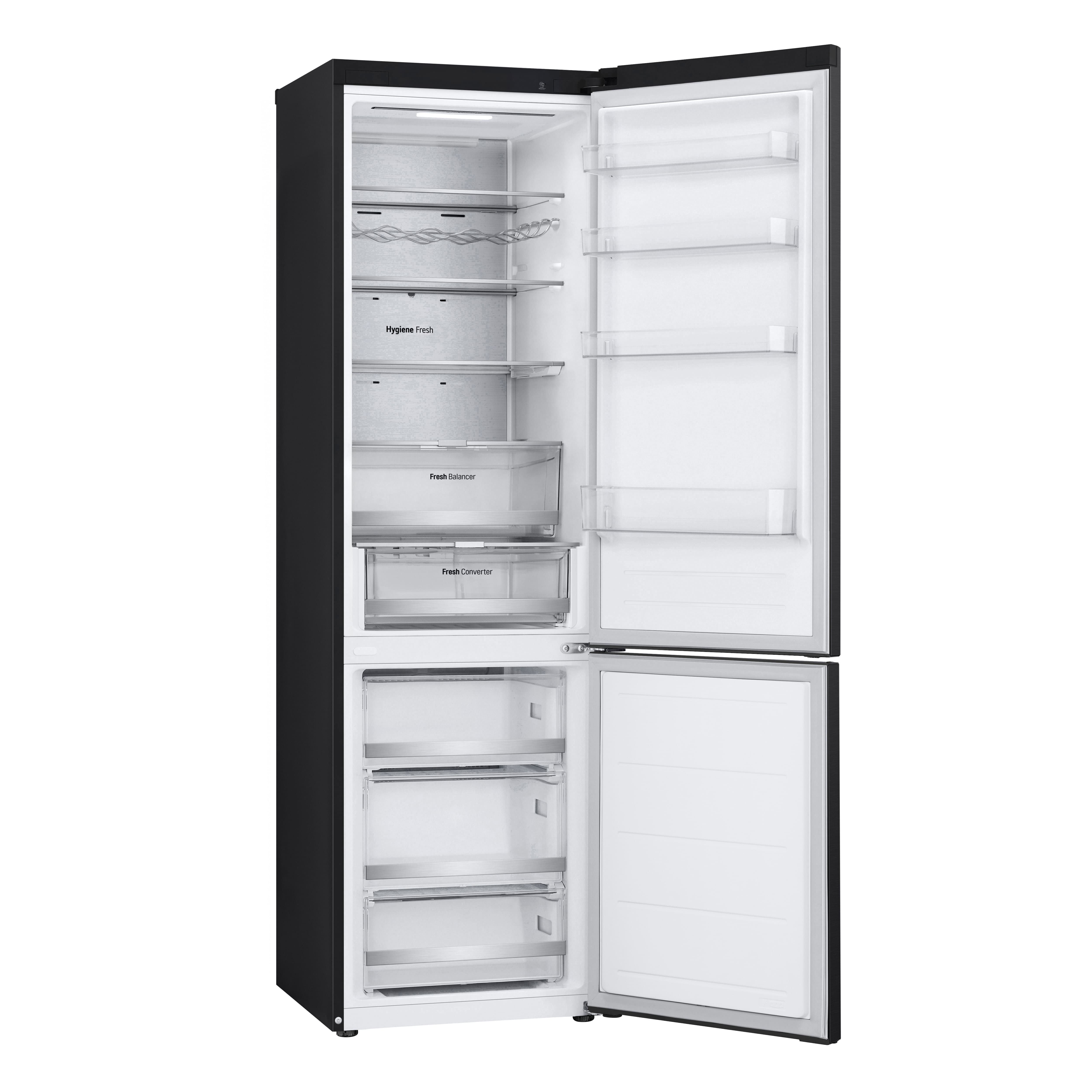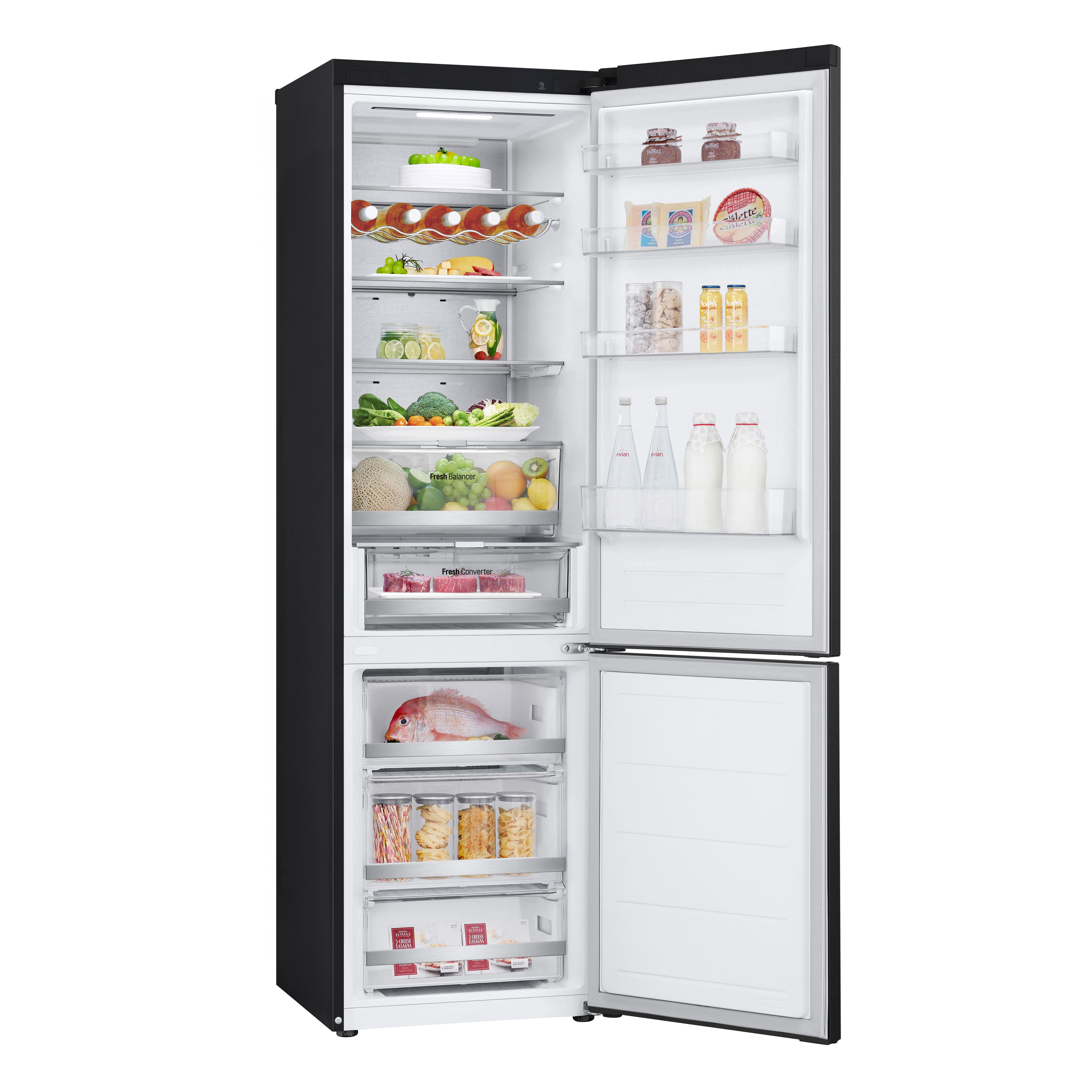 Холодильник LG з нижн. мороз., 203x60х68, холод.відд.-277л, мороз.відд.-110л, 2дв., А++, NF, інв., диспл зовн., Fresh Сonverter, Metal Fresh, чорний