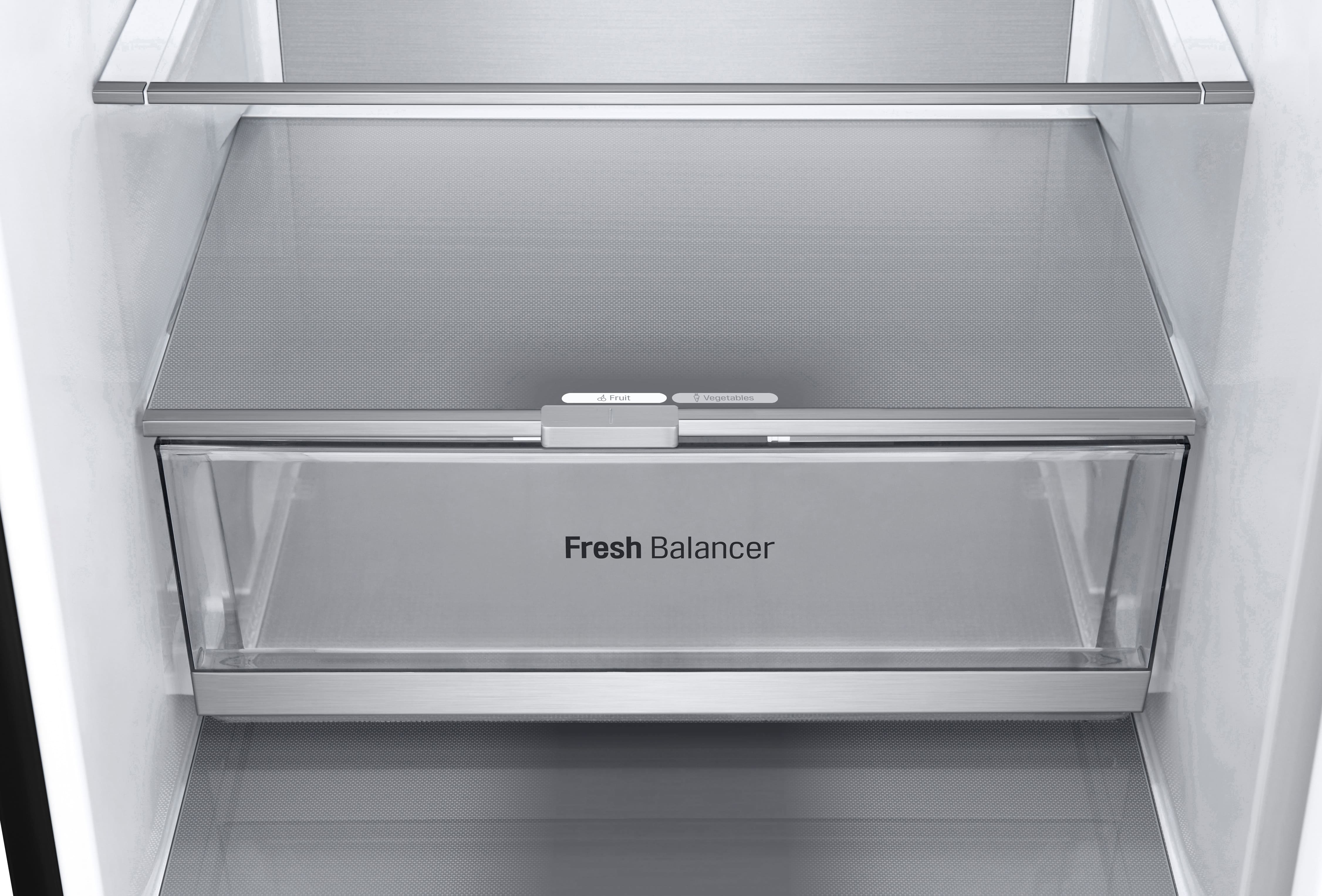LG Холодильник з нижн. мороз., 203x60х68, холод.відд.-277л, мороз.відд.-110л, 2дв., А++, NF, інв., диспл зовн., зона св-ті, Metal Fresh, чорний