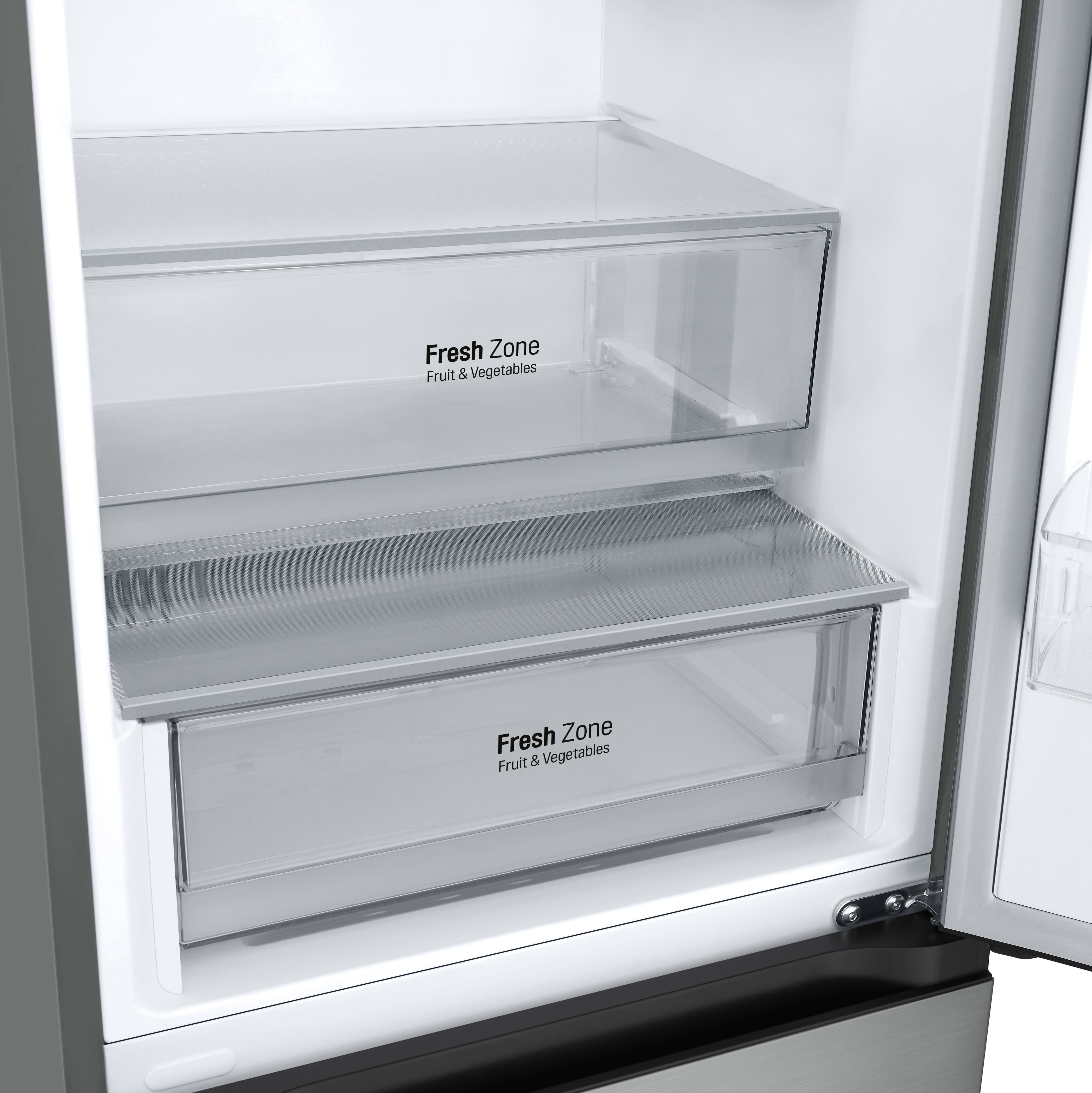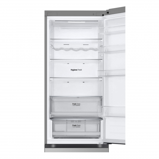 LG GC-B509FNMW – це сучасний холодильник із нижньою морозильною камерою та загальним об’ємом 387 л (277 л – холодильне відділення, 110 л – морозильне). Технологія No Frost запобігає утворенню льоду, а інверторний компресор забезпечує тиху та енергоефективну роботу. Зона свіжості зберігає продукти довше, а зовнішній дисплей дозволяє легко керувати налаштуваннями.
