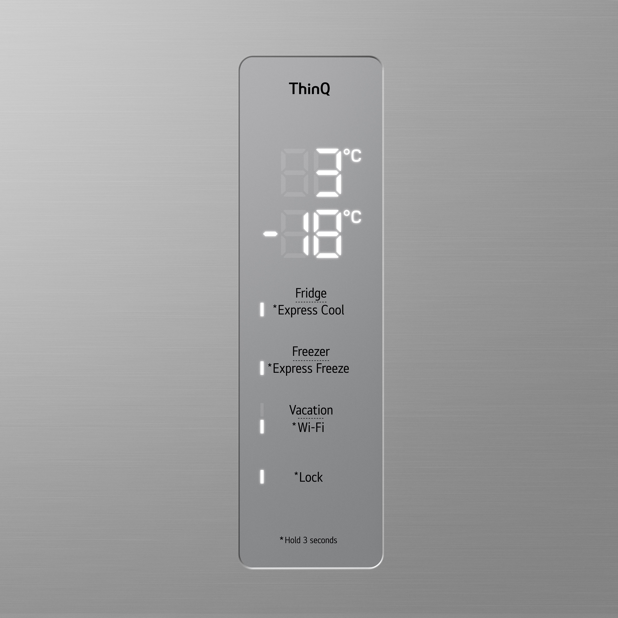 Холодильник LG з нижн. мороз., 203x60х68, холод.відд.-277л, мороз.відд.-110л, 2дв., E, NF, інв., диспл зовн., зона св-ті, сріблястий