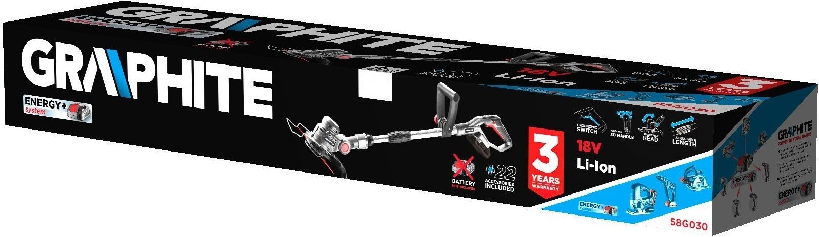 Акумуляторний садовий тример GRAPHITE 58G030 є частиною серії інструментів Energy+, що працюють від 18В Li-Ion акумуляторів. Цей інструмент призначений для підстригання трави та догляду за газонами, особливо у важкодоступних місцях, де звичайна газонокосарка не може дістатися.