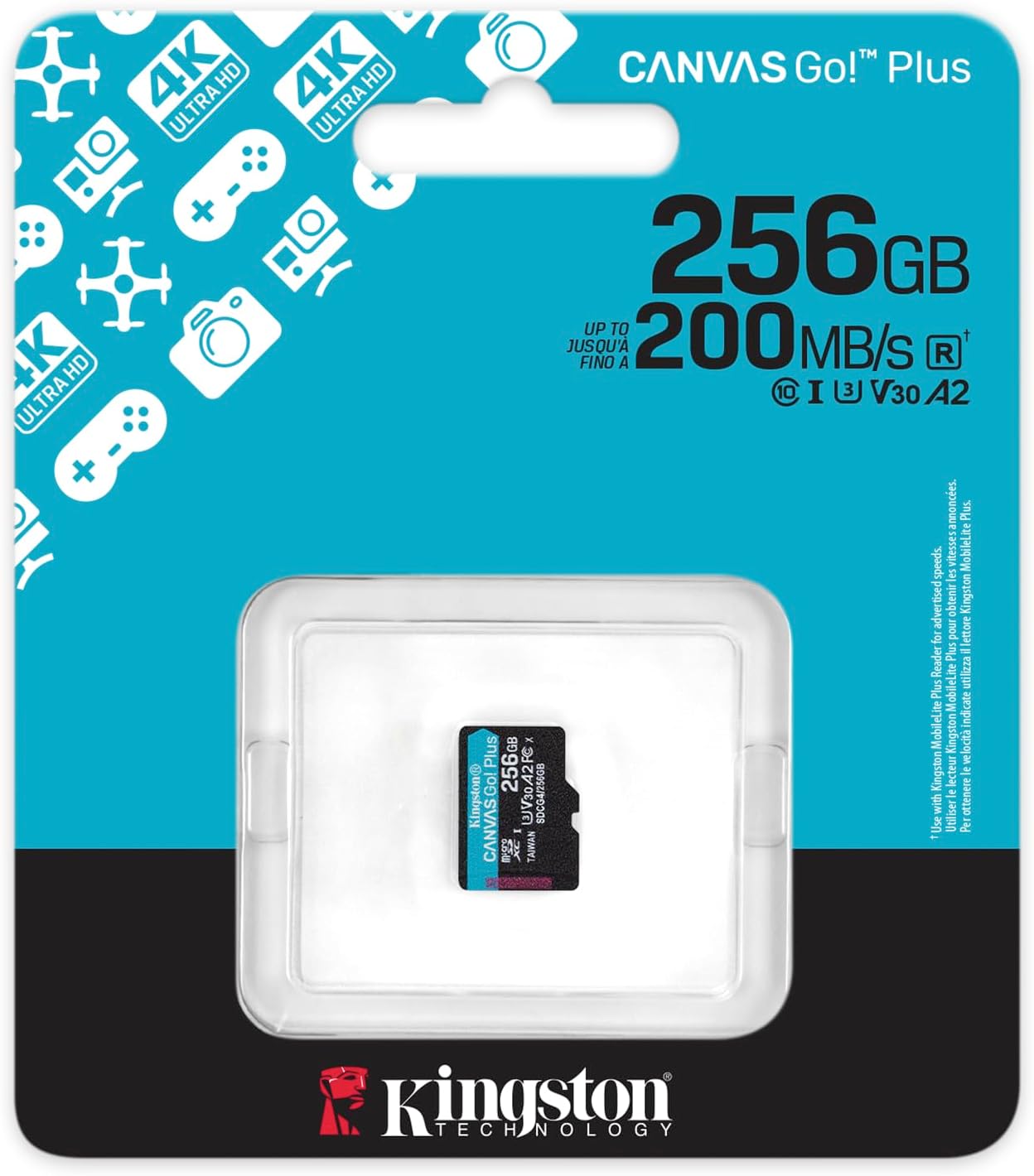 Карти пам’яті Canvas Go! Plus microSD від Kingston призначені для любителів пригод і мобільних геймерів, які потребують високої продуктивності де би вони ні були. Завдяки блискавичній швидкості передачі даних до 200 МБ/с вони допомагають спростити робочий процес, щоб ви могли приділяти більше часу зйомці та створенню відео.