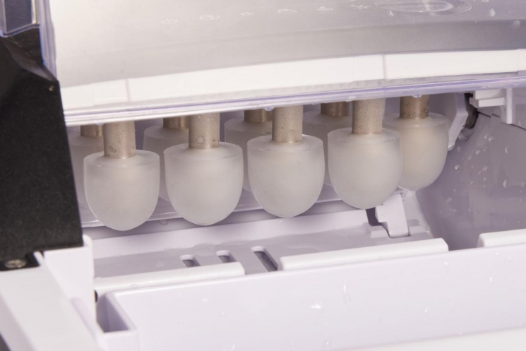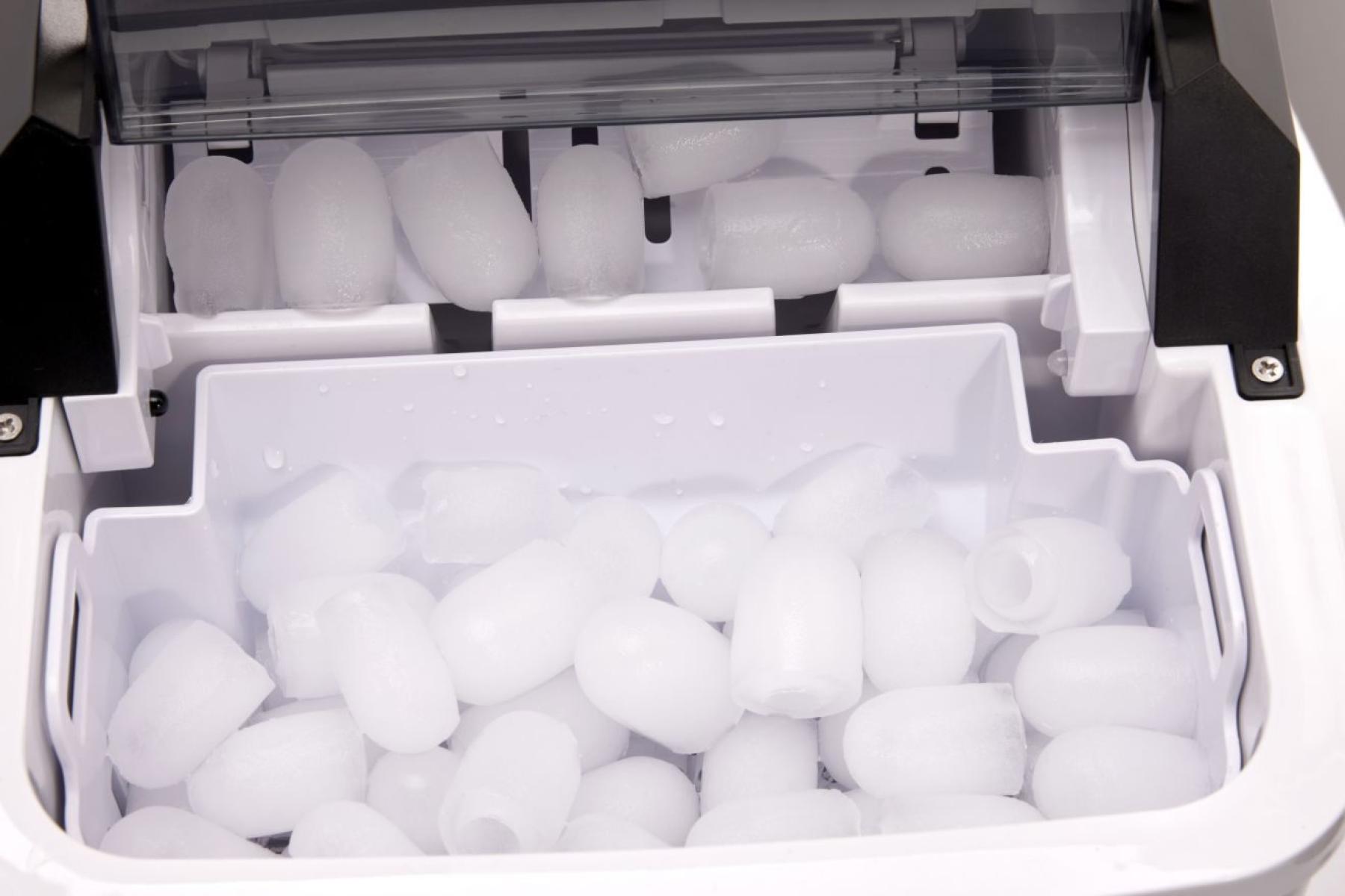 Льодогенератор не потребує підключення до водопроводу — просто залийте воду, натисніть кнопку й насолоджуйтеся готовим льодом за кілька хвилин. У комплекті — контейнер для льоду та лопатка.