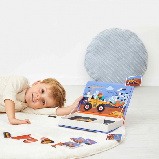 Місто росте: настав час нових будівель, а працівники на об'єкті не проти трохи допомогти! Ця магнітна навчальна гра неодмінно сподобається шанувальникам спорядження віком від 3 років. Стимуляція уяви є ключовим етапом у розвитку дитини: за допомогою цієї книги ваш малюк буде схильний уявляти незліченну кількість історій та транспортних засобів. Вони можуть або звертатися до моделей і барвистих ілюстрацій, або уявляти власні історії від А до Я, змішуючи магніти.