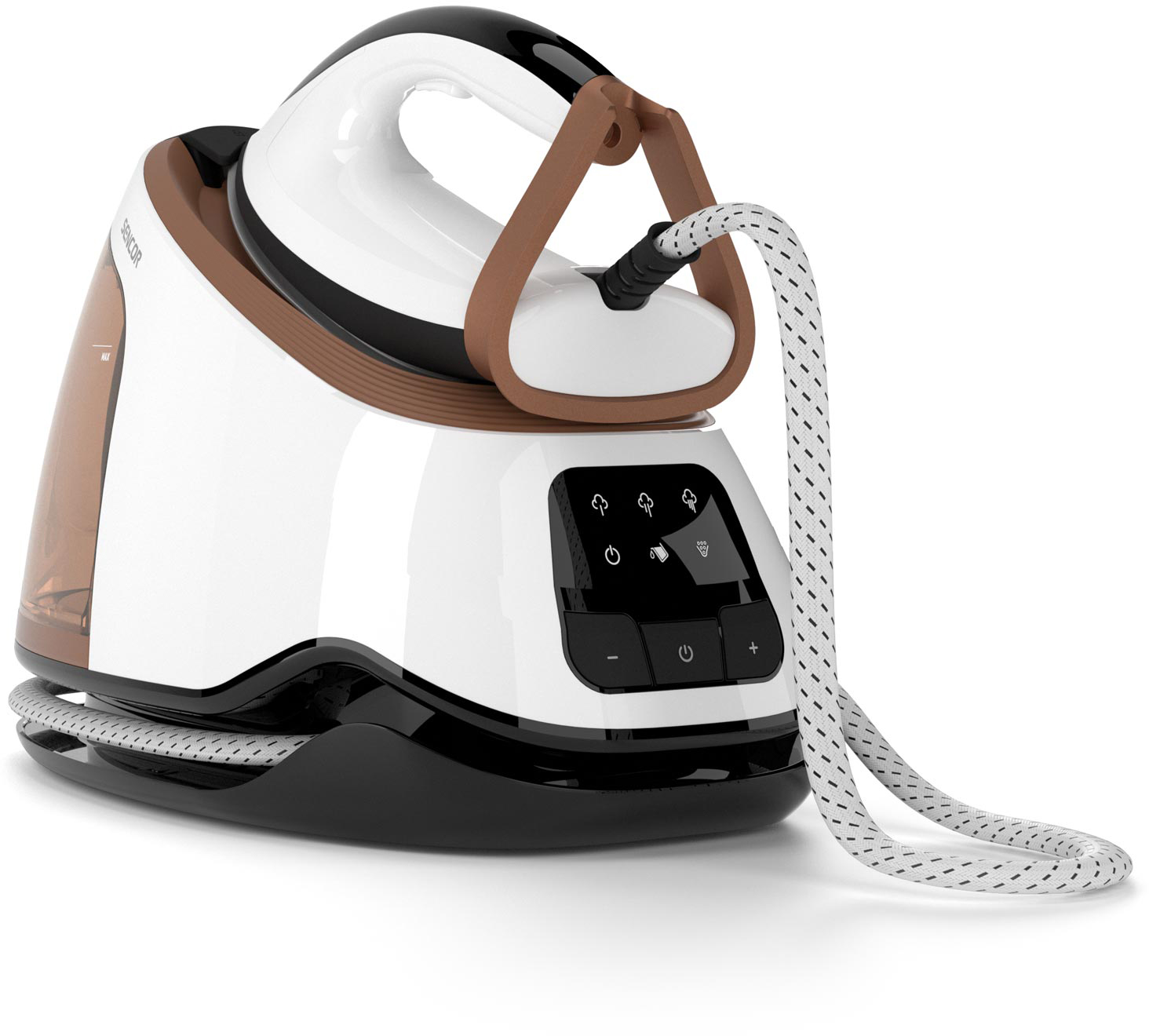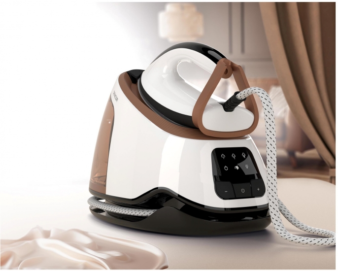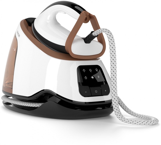 Парогенератор Gorenje потужністю 3000 Вт має знімний резервуар об’ємом 1,5 л, постійну подачу пари 160 г/хв і паровий удар 480 г/хв. Оснащений LED-дисплеєм, цифровим керуванням, системою проти накипу, індикатором зносу картриджа, автоматичним вимкненням та керамічною підошвою. Тиск пари – 8 бар.