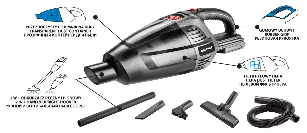 Акумуляторний пилосос 2-в-1 GRAPHITE 58G097 є частиною серії інструментів Energy+, що працюють від 18В Li-Ion акумуляторів (не входять у комплект). Цей універсальний пристрій поєднує функції вертикального та ручного пилососа, забезпечуючи ефективне прибирання в будинку, гаражі або майстерні.