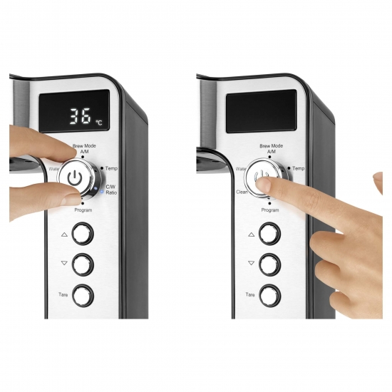 У ручному режимі ви можете вибрати температуру води від 80 до 98 °C та інтенсивність приготування кави. Вбудовані ваги з функцією тари допомагають у приготуванні кави Кавоварка оснащена тримачем для кавового фільтра з нержавіючої сталі, світлодіодним дисплеєм і ручкою управління. Розкішний графин з високоякісного скла вміщує 1 літр кави.