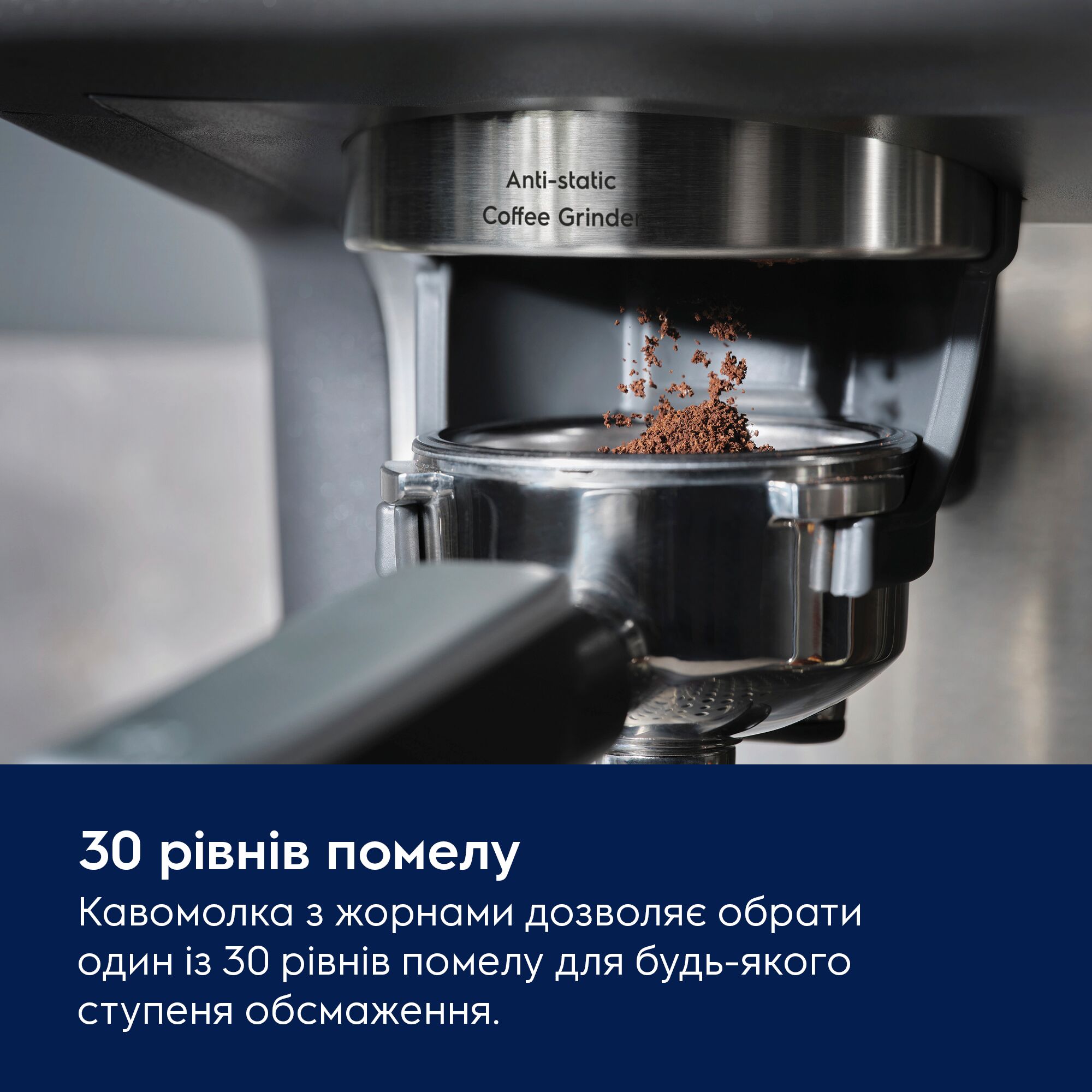 Вбудована кавомолка регулюється на 30 рівнів подрібнення для точних уподобань при будь-якому обсмажуванні бобів. Антистатична технологія кавомолки допомагає запобігти розкидуванню порошку для чистішого приготування кави.