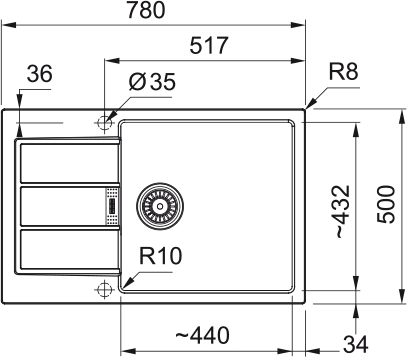 Опис Мийка кухонна Franke Sirius 2 тектонайт, прямокут., з крилом, 780х500х200мм, чаша - 1, врізна, бежевий