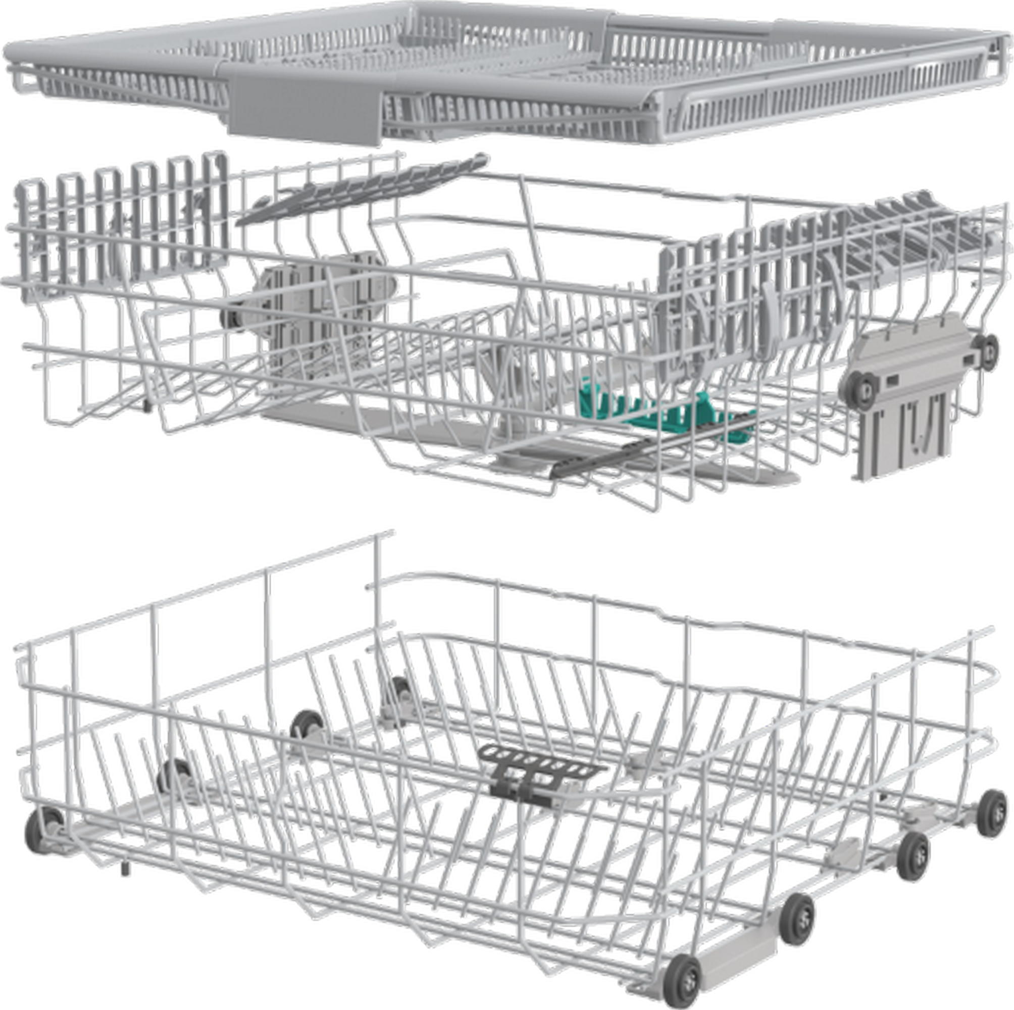 Конструкцію з 3 кошиками можна адаптувати до будь-якої ситуації. Середній кошик обладнано кульковими підшипниками, тож ви будете приємно вражені його тихим і плавним рухом. До того ж, його висоту можна змінювати на 4 см, а лоток для столових приборів можна регулювати, тож ви зможете вмістити посуд різних форм і розмірів. Завдяки наявності трьох кошиків можна вимити до 16 комплектів посуду одночасно.
