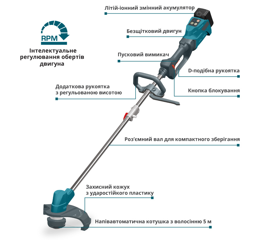 Функція захисту від перенавантаження є важливим елементом безпеки наших тримерів. В критичній ситуації тример автоматично вимикається.