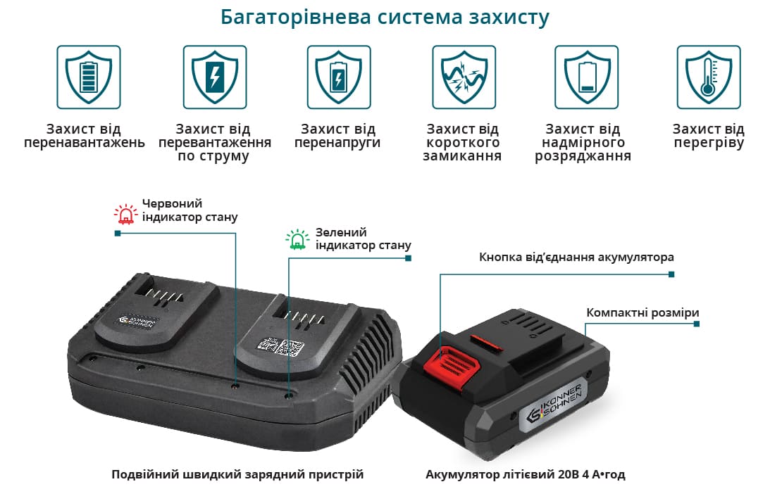 Універсальні акумулятори підходять для всіх акумуляторних садових інструментів Könner & Söhnen®, отже достатньо один раз придбати акумуляторну батарею обраної ємності, зарядний пристрій і використовувати їх з іншими акумуляторними інструментами.