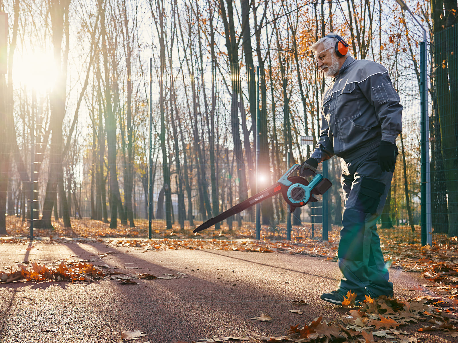 Садова повітродувка працює на двох акумуляторах 20В, забезпечує тривалу роботу без підзарядки, немає обмежень дроту та привʼязки до розеток.