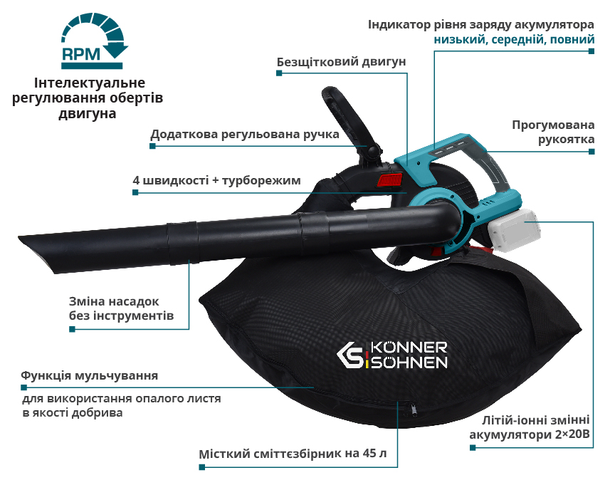 Садовий пилосос простий у використанні, легко збирається та запускається, практично не потребує технічного обслуговування та максимально ефективно виконує найнеобхідніші функції по прибиранню території: в режимі всмоктування він допоможе зібрати садове сміття, листя, гілки або інші дрібні відходи, пил, тирсу. Об’ємний мішок для збору сміття 45 літрів дозволяє зібрати велику кількість сміття, а завдяки інтегрованому подрібнювачу може здійснювати мульчування листя та трави, зменшуючи їх об’єм до 10 разів від початкового об’єму. Отриману мульчу можна використовувати в якості добрива на ділянці.