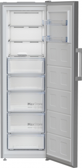 Вертикальна морозильна камера з об’ємом 286 л, класом енергоефективності A+ і системою No Frost — без інею й крижаної кірки. Максимальна продуктивність — до 14 кг продуктів на добу. Вбудований електронний дисплей і сигнал відкритих дверцят спрощують користування. Захист від дітей, можливість перевішення дверей, LED-освітлення й модуль FreezerGuard — гарантія стабільної роботи навіть за температур до –15 °C. За рік споживає близько 332 кВт·год, працює тихо (38 дБ). Висота ~186 см, ширина 60 см, глибина 71 см — підходить для кухонь із обмеженим простором. Надійний вибір для великої сім’ї чи кафе.