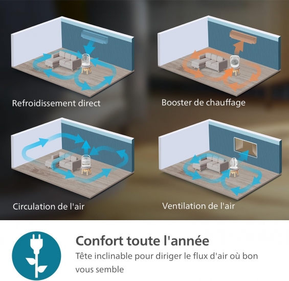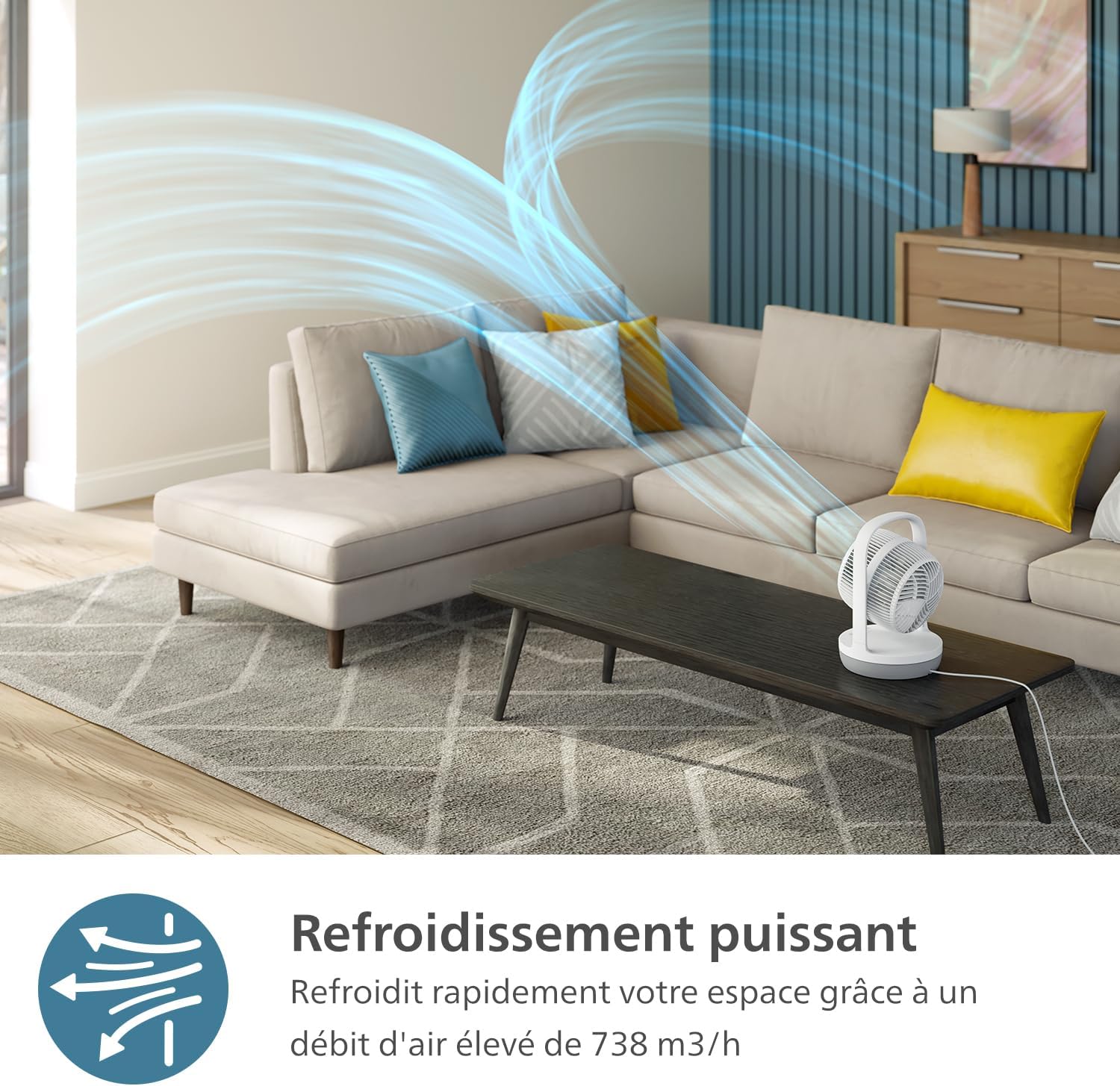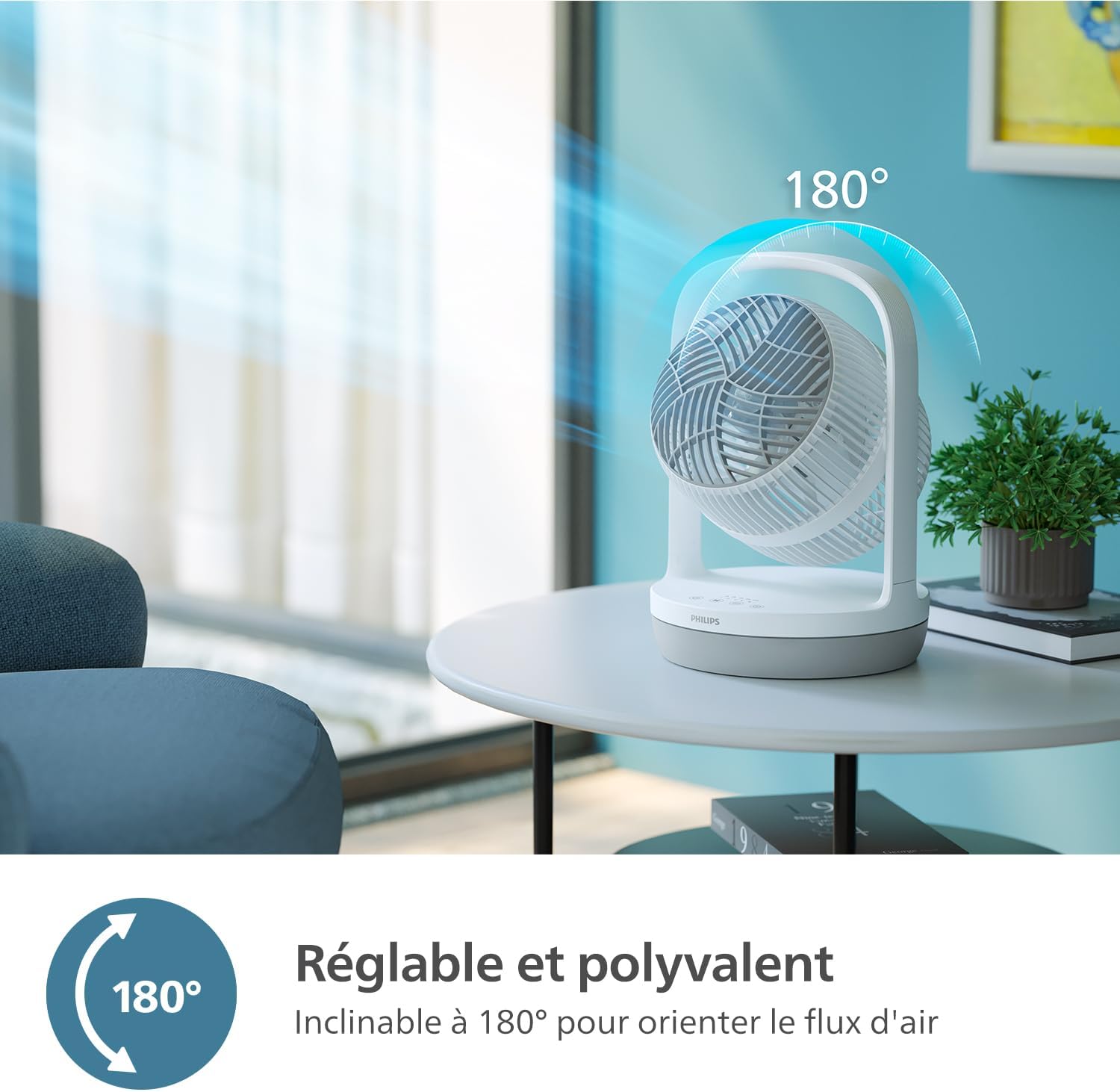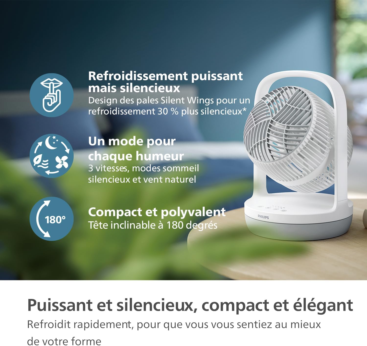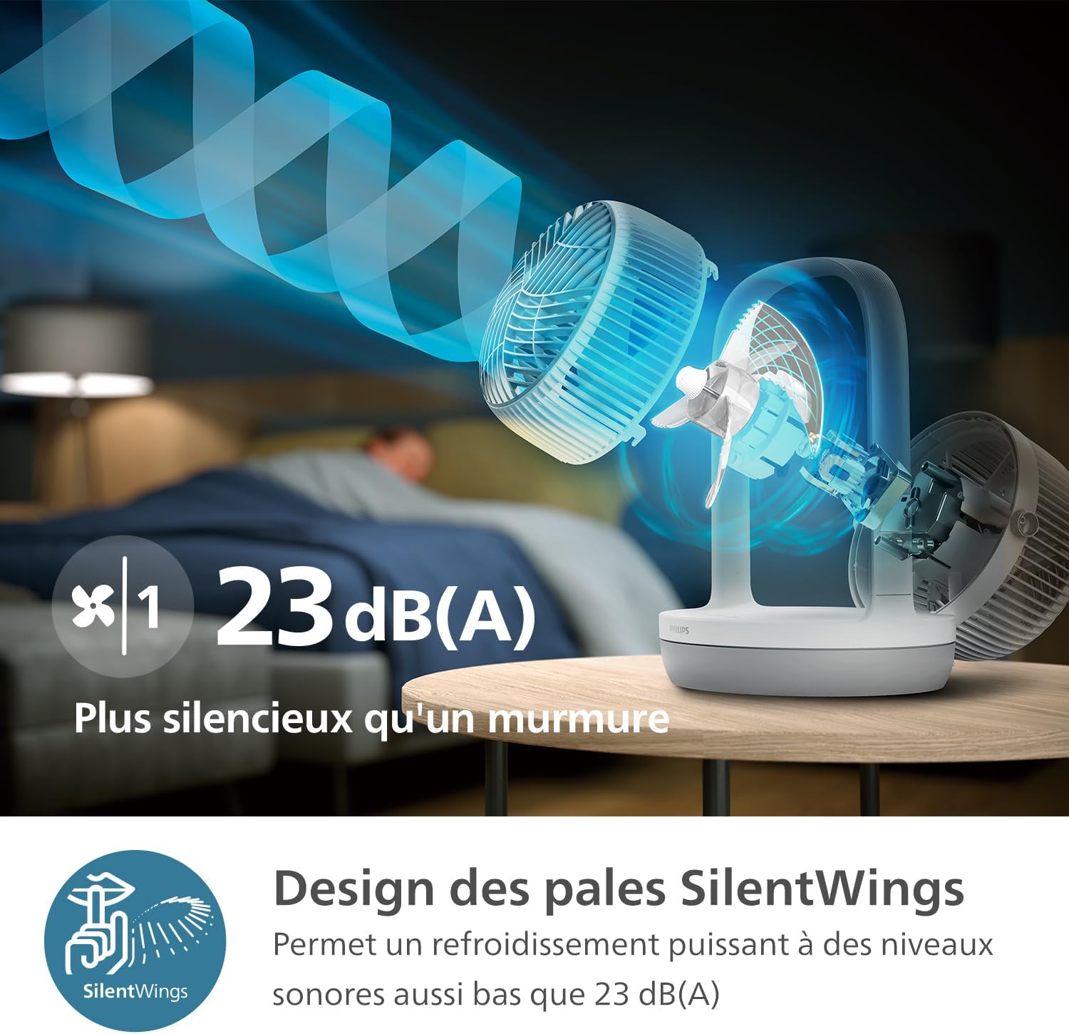 Вентилятор Philips CX2050/00 — це компактне та потужне рішення для охолодження вашого простору. Завдяки технології SilentWings він працює майже безшумно (від 23 дБ), що робить його ідеальним для використання вночі або в офісі. Пристрій оснащений трьома швидкостями та двома режимами роботи, включаючи "Нічний режим" та "Природний бриз", які імітують природну вентиляцію. Поворот на 180° забезпечує рівномірний розподіл повітря. Його діаметр 22 см та потужність 24 Вт дозволяють ефективно охолоджувати приміщення. Таймер з налаштуванням на 1, 2, 3, 6 або 12 годин забезпечує додаткову зручність. Легкий та стильний дизайн у білому кольорі робить його ідеальним доповненням до будь-якого інтер'єру.​