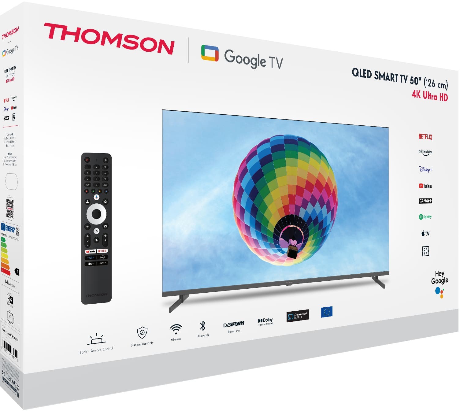Thomson 50QG4S14 — це сучасний 50-дюймовий QLED-телевізор із роздільною здатністю 4K UHD (3840×2160), створений для тих, хто цінує глибокі кольори, розширений динамічний діапазон і зручність інтелектуального керування. Він побудований на базі платформи Google TV, яка надає доступ до тисяч додатків і стрімінгових сервісів — Netflix, YouTube, Disney+, Megogo та інших.