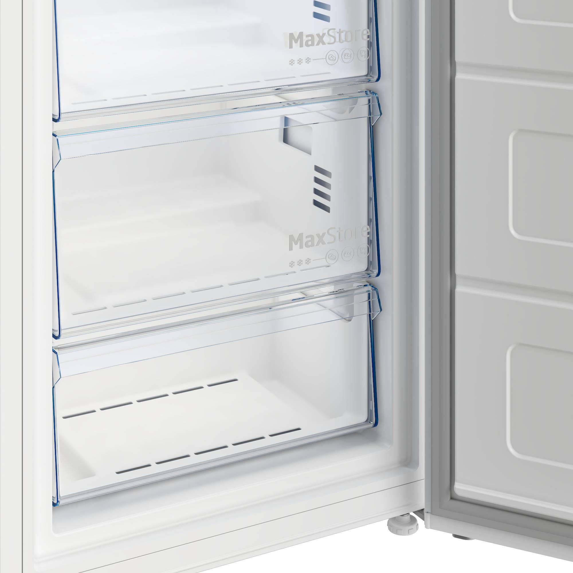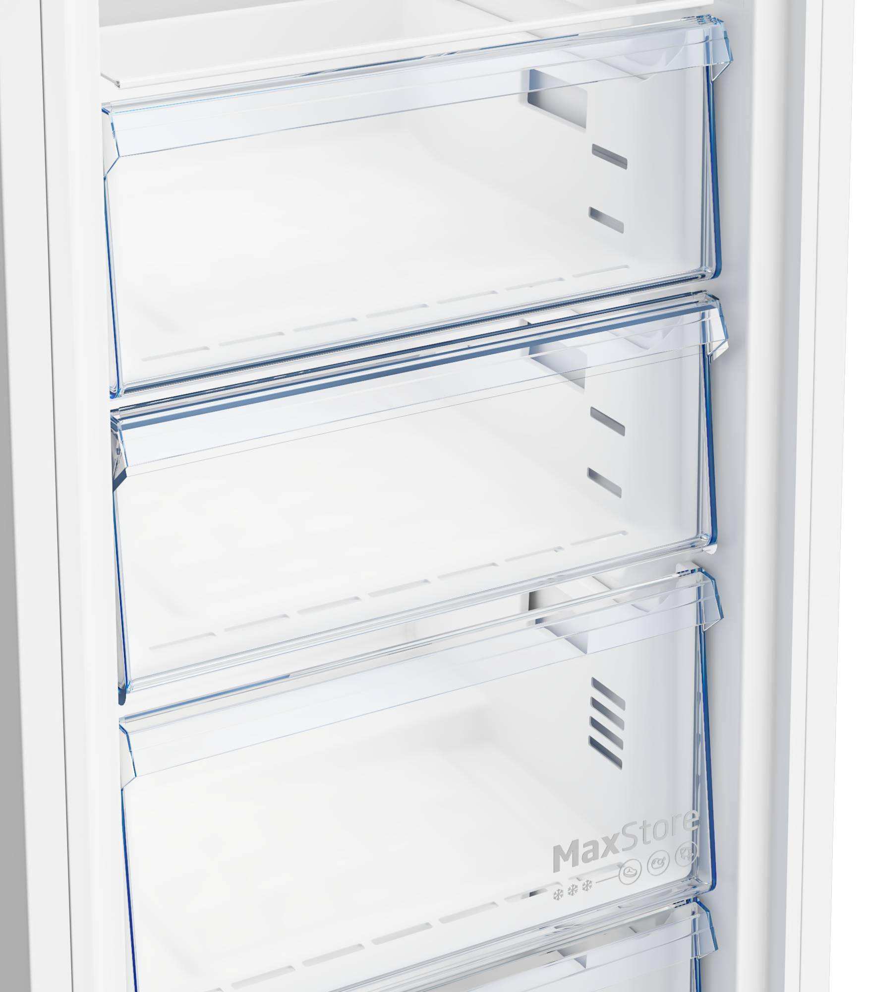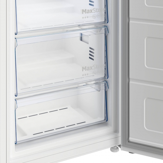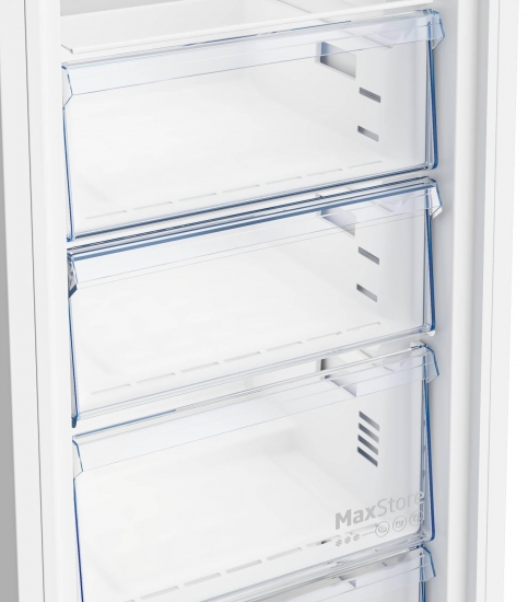 Морозильна камера Beko B1RFNE293W — зручне рішення для зберігання великої кількості продуктів. Завдяки технології NoFrost більше немає потреби розморожувати вручну. Модель має корисний об'єм 260 л, оснащена 5 ящиками для організації простору, сигналом відкритих дверцят та функцією перенавішування дверцят. Відмінно працює навіть при -15°C завдяки технології FreezerGuard.