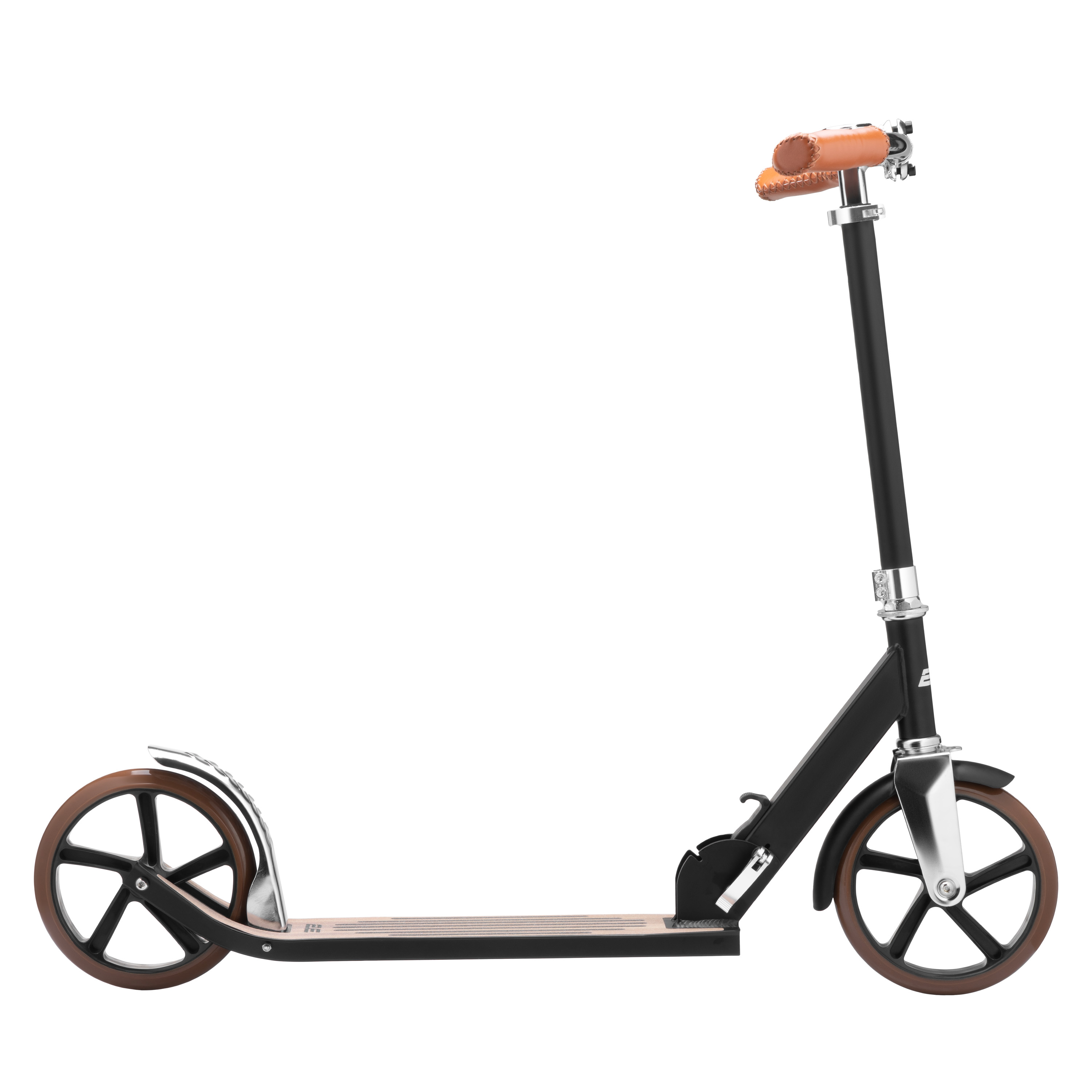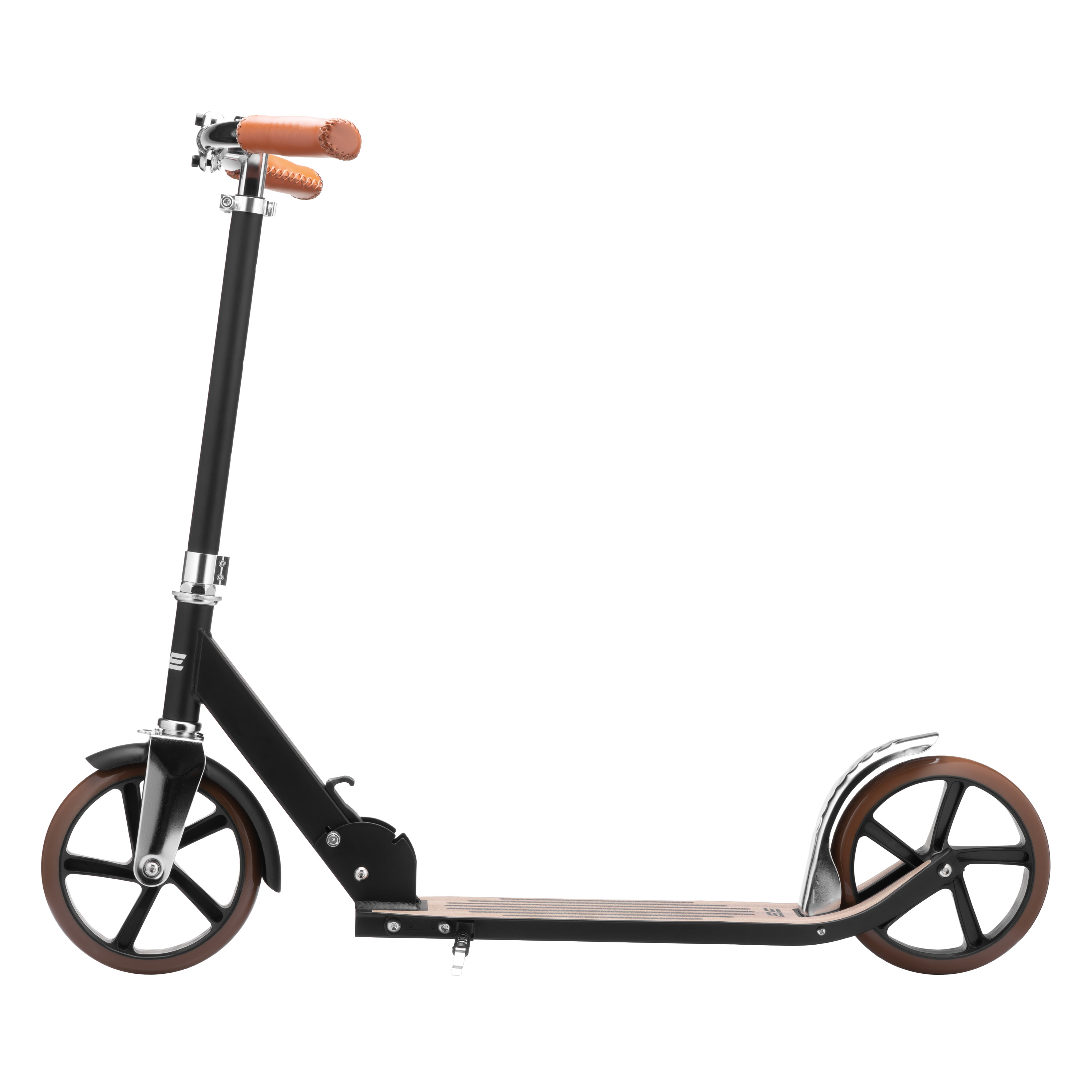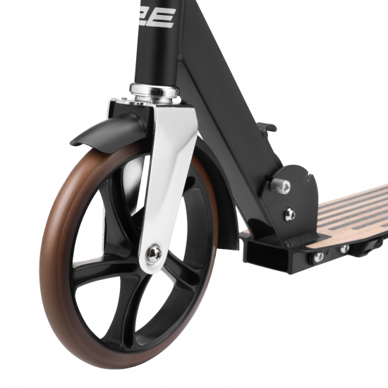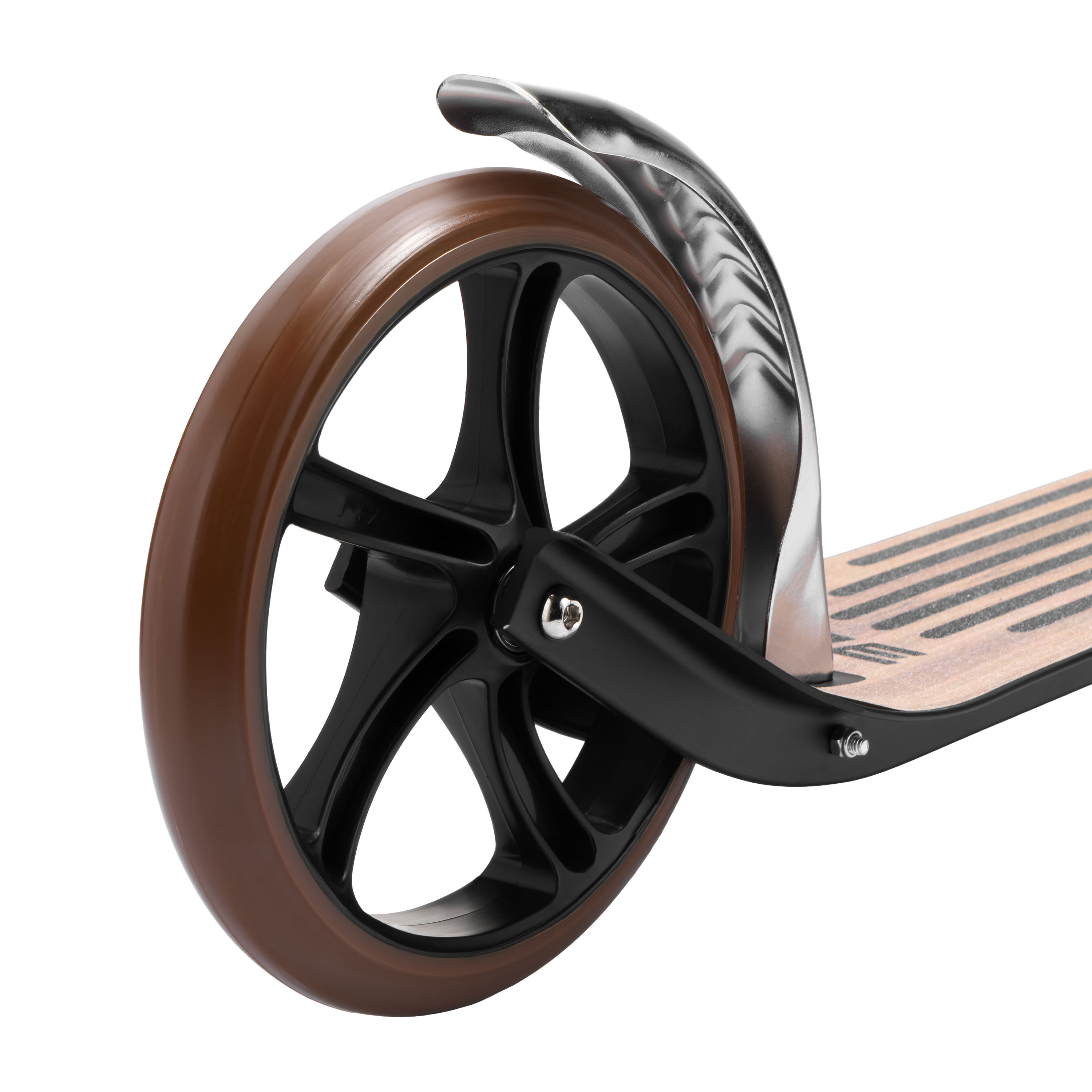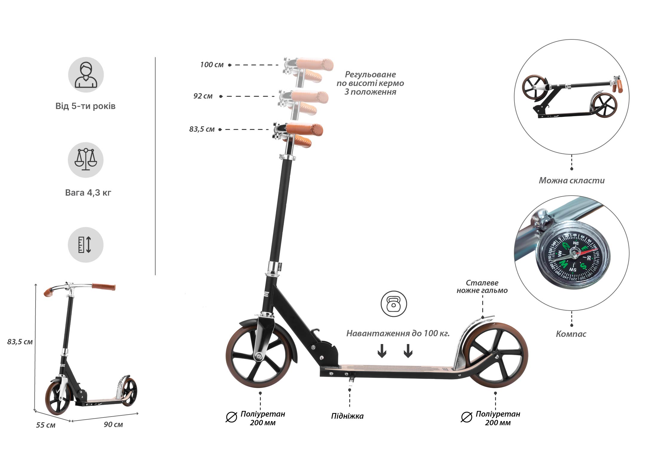 Великі поліуретанові колеса діаметром 200 мм є ключовим елементом для забезпечення плавної та комфортної їзди. Поліуретан має високу зносостійкість і добре поглинає вібрації, що особливо важливо під час руху нерівним асфальтом чи бруківкою. Завдяки такому діаметру колеса легко долають невеликі перешкоди, а самокат розвиває хорошу швидкість за менших зусиль.