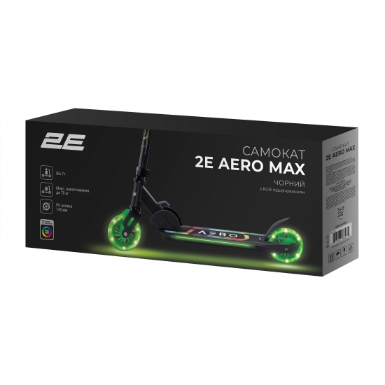 Самокат 2E Aero MAX RGB створено для дітей віком від 7 років і підлітків (із максимальним навантаженням до 70 кг). Ця модель – справжня зірка вулиць! Завдяки унікальному RGB-підсвічуванню та напівпрозорим колесам із підшипниками 5-го класу, кожна поїздка перетвориться на незабутню подію.