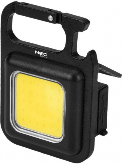 Лампа для ключів 99-109 від NEO TOOLS - це багатофункціональний інструмент, оснащений відкривачкою для пляшок, магнітом, спинкою та затискачем для ключів. Лампа випромінює світло потужністю 500 ЛлмМ завдяки 30 світлодіодам COB і живиться від літій-іонного акумулятора 3,7 500 мАг. Він має невелику вагу 58 г та розміри 6 x 4,6 мм. Час роботи пристрою становить 3 години після попередньої 3-годинної зарядки. Заряджання здійснюється через порт USB C. У комплект входить кабель USB C.