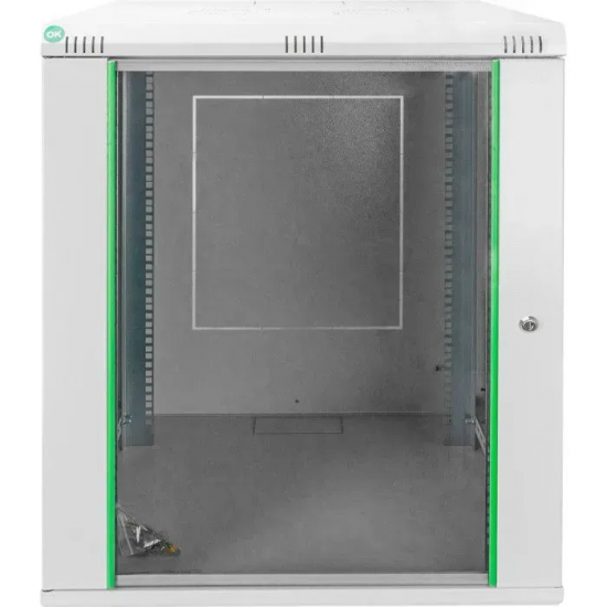 Фронтальні скляні двері з металевою рамою оснащені надійним 1-точковим замком, відкриваються під кутом до 235°, що забезпечує легкий доступ до обладнання. Профільні рейки, розташовані попереду і ззаду, оцинковані, мають чітке маркування висоти (U) та регулюються по глибині (від 320 до 450 мм), що дозволяє оптимально налаштувати простір під конкретне обладнання.