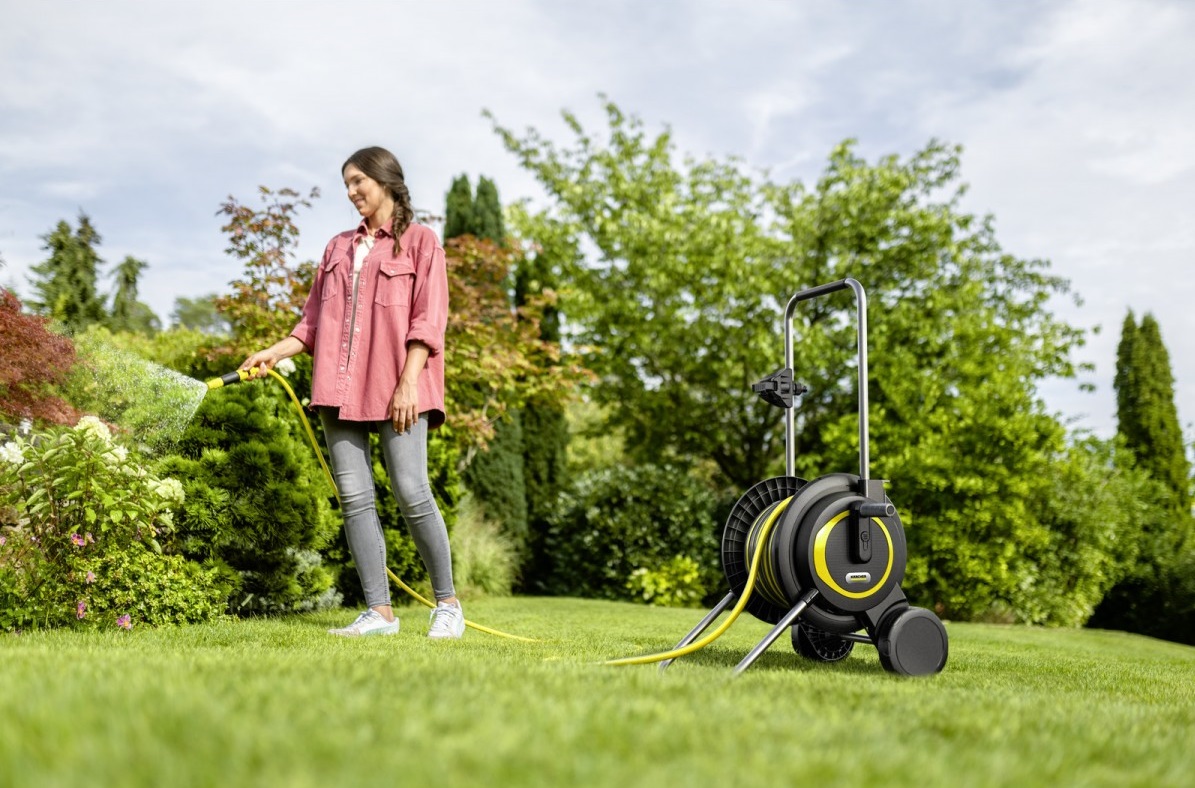 Візок для садового шланга, 15-792, NEO, ідеальний для саду. Поливальний шланг для саду зазвичай має довжину кілька десятків метрів, що робить його не лише важким, а й незручним у перенесенні. Крім того, його зберігання утруднене. У цьому випадку візок – відмінне рішення.