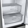 Сучасний холодильник з об’ємом 384 л, нижньою морозильною камерою на 107 л і тихою роботою (35 дБ). Інверторний компресор і технологія Total No Frost забезпечують ефективне охолодження без інею. Оснащений DoorCooling+, зонами свіжості Fresh Balancer і Fresh Converter, Wi-Fi-керуванням LG ThinQ, дисплеєм, LED-підсвіткою та складаною полицею. Енергетичний клас A++, споживання – 288 кВт/рік.