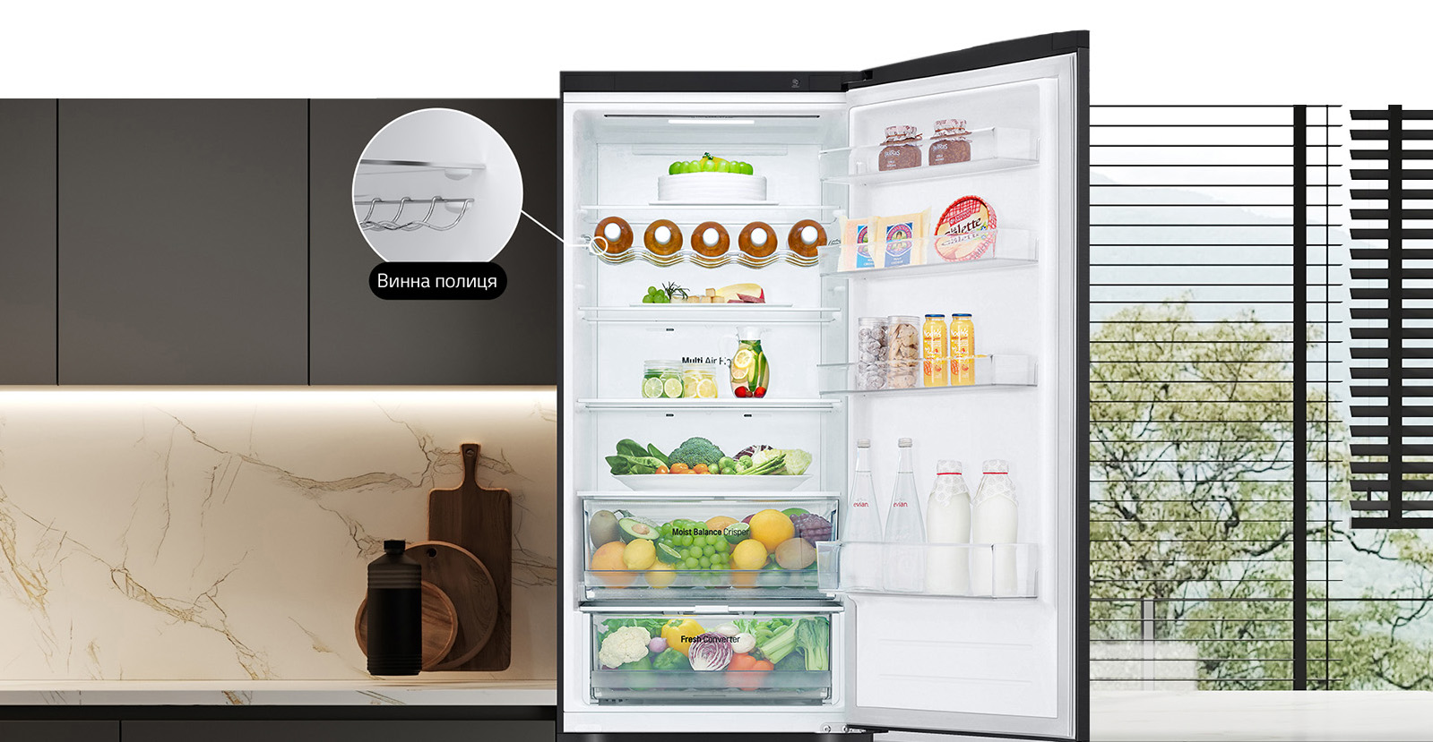 Завдяки комірчастій структурі кришки Moist Balance Crisper конденсат накопичується в сотах, запобігаючи потраплянню крапель на продукти. У той же час вода повільно випаровується, створюючи оптимальний рівень вологості. Це дозволяє зберегти фрукти і овочі свіжими набагато довше при збереженні їх корисних властивостей і смакових якостей.
