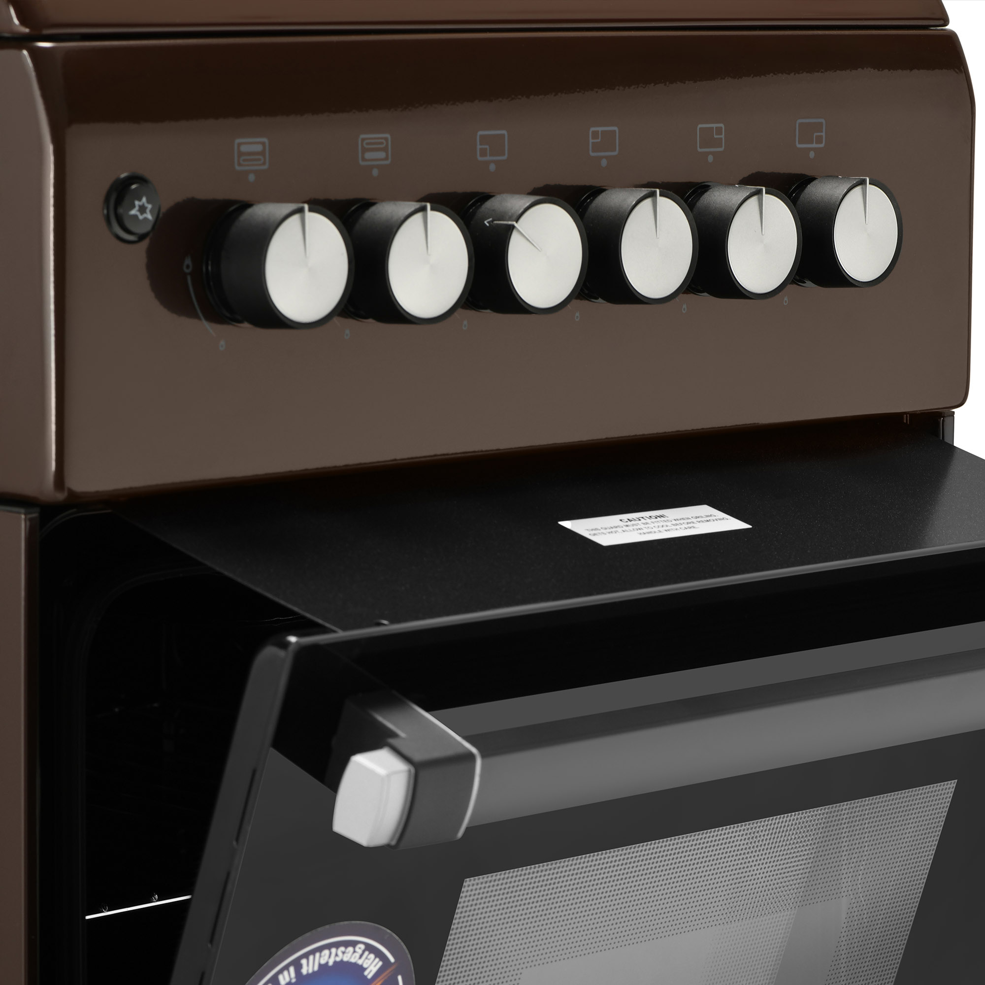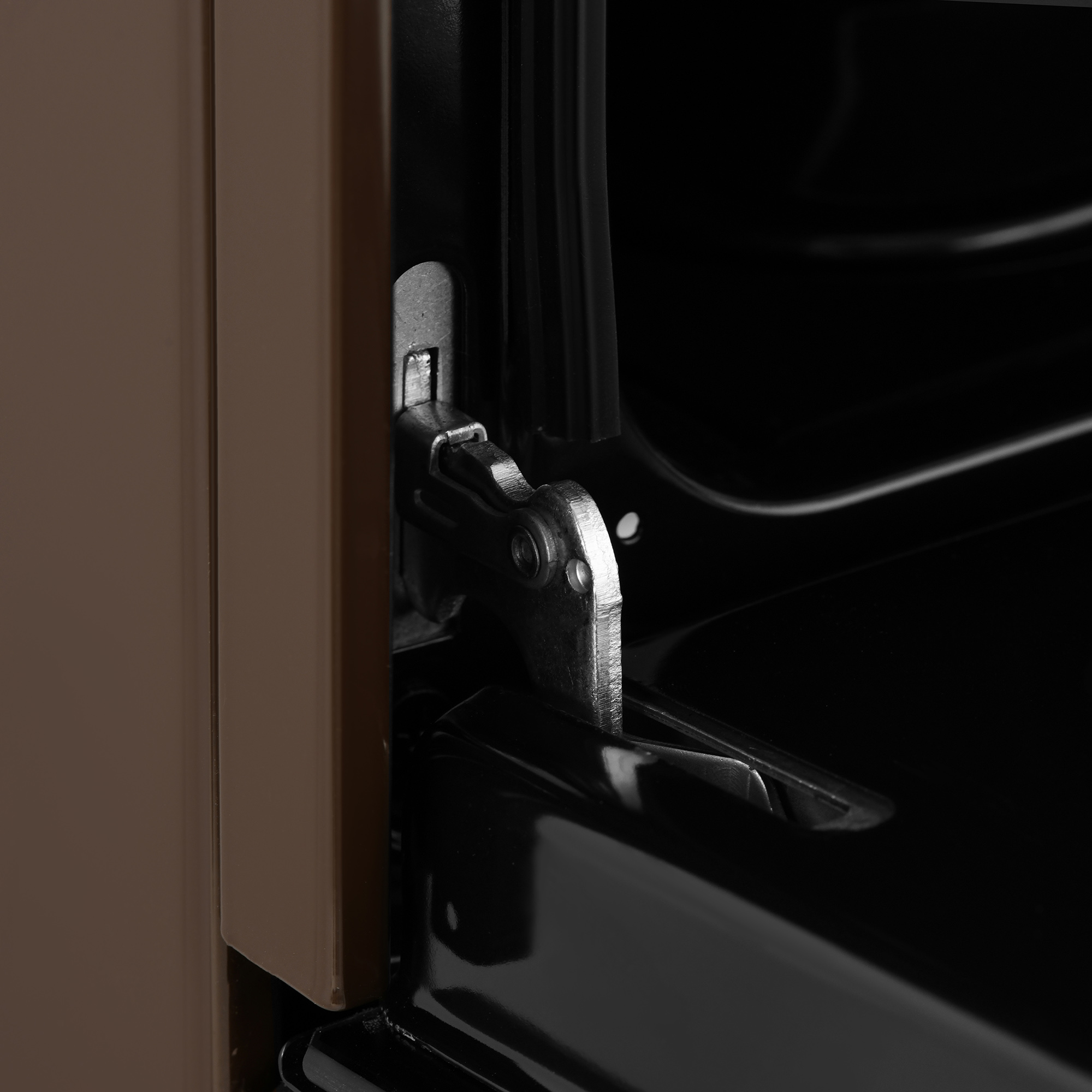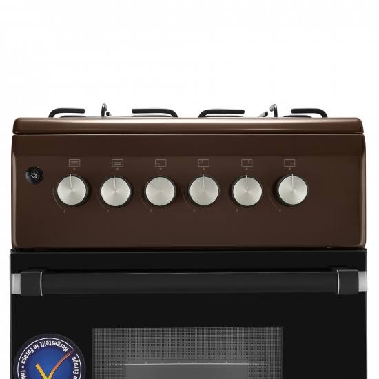 Об’єм газової духової шафи становить 50 л. Її оснащено нижнім і верхнім нагрівальними елементами потужністю 2,75 і 2,2 кВт відповідно, що зумовлює рівномірне пропікання страв з обох боків. Завдяки п’ятьом рівням рельєфних напрямних зручно розташовувати решітку або деко залежно від об’єму страви. Дверцята мають два термостійкі стекла, до того ж внутрішнє за потреби можна зняти – це спрощує догляд і забезпечує гігієнічність. Емальовану поверхню внутрішньої камери легко очистити, тому її не потрібно довго відтирати після приготування, наприклад, м’ясних страв із соусом.