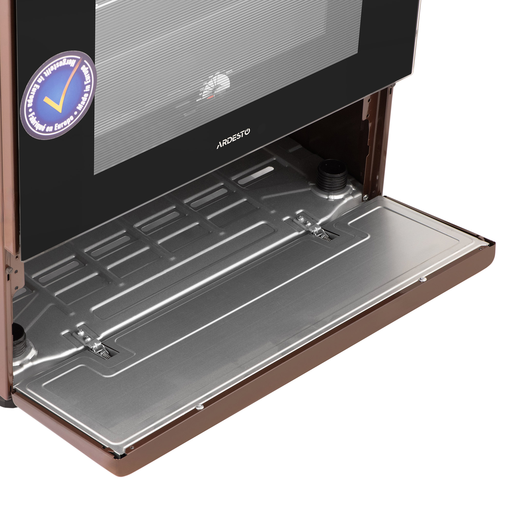Конструкцією моделі передбачено відкидний нижній ящик, що стане в пригоді для зберігання посуду або деко. У комплекті є одна решітка й одне стандартне деко, тому можна відразу розпочати приготування без придбання додаткових аксесуарів. Скляна кришка додає плиті завершеного вигляду та захищає стіну від бризок, до того ж може слугувати як додаткова робоча поверхня .