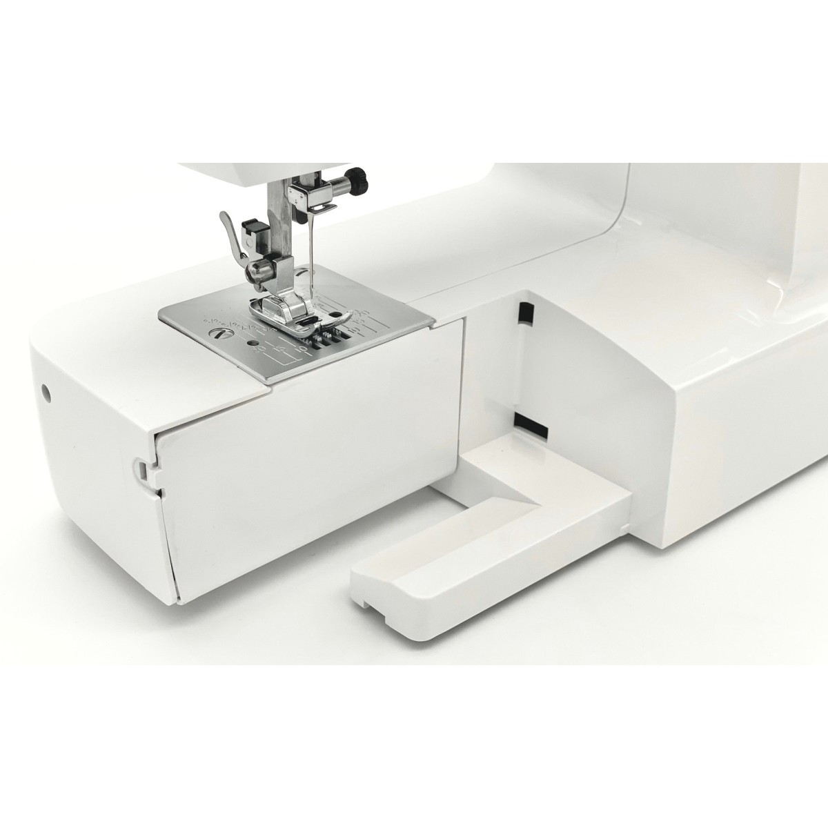 Машинка також має знімну рукавну консоль, що спрощує обробку вузьких виробів (рукавів, штанин тощо), а посилений нижній транспортер тканини забезпечує рівномірну подачу матеріалу під час шиття. Дворівневий підйом лапки (до 14 мм) дозволяє працювати навіть із товстими або багатошаровими тканинами.