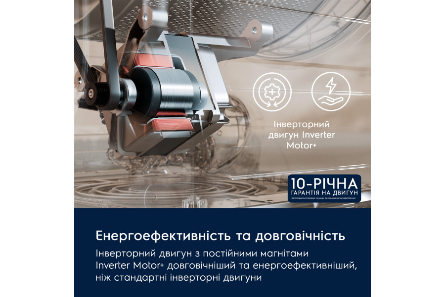 Серцем цієї моделі є інверторний двигун Inverter Motor+, який забезпечує не лише енергоефективність, але й знижений рівень шуму — лише 53 дБ під час прання. Система SensiCare автоматично регулює тривалість циклу, запобігаючи надмірному пранню та зберігаючи якість тканин.