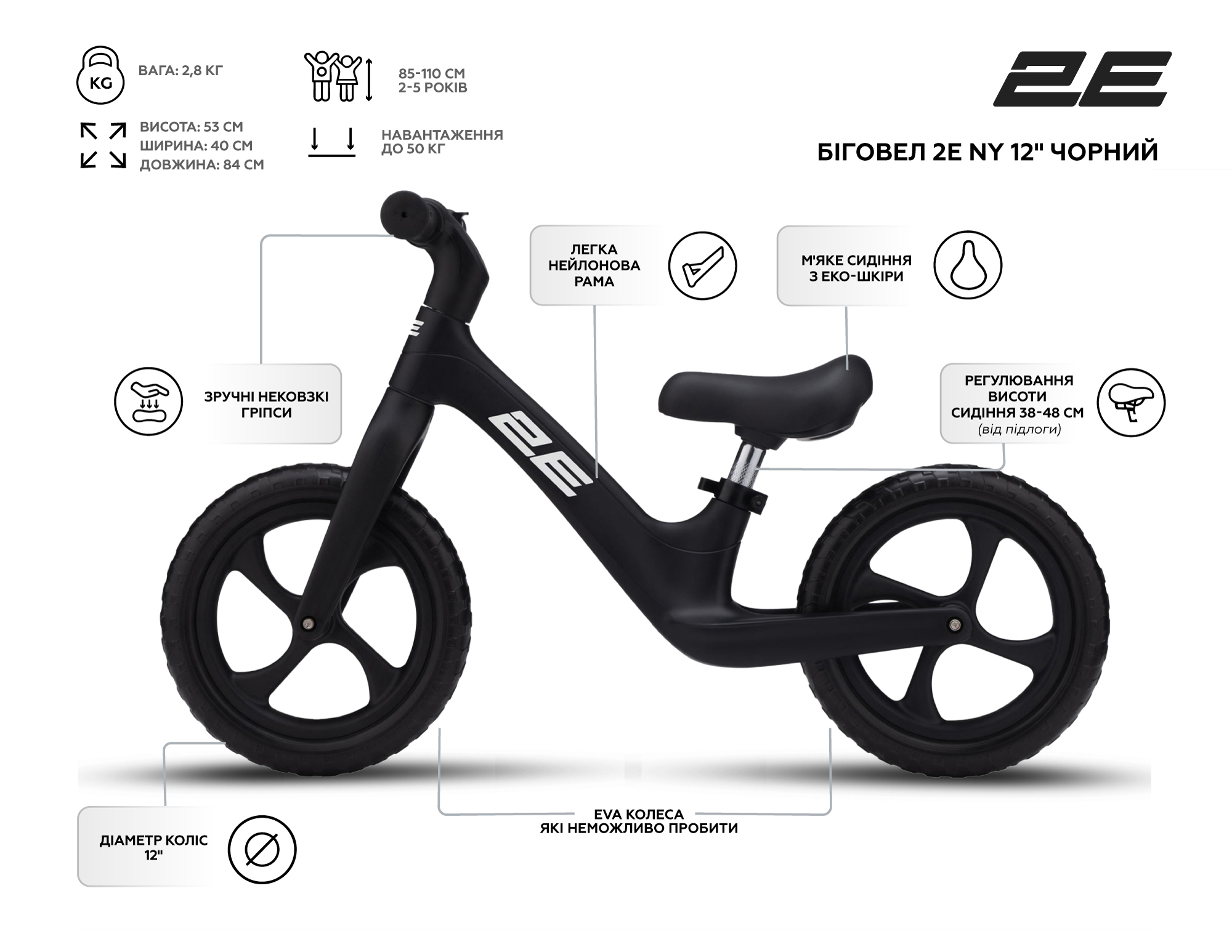 Однією з основних переваг біговела 2E NY є його легка, проте міцна нейлонова рама, яка забезпечує комфорт і стабільність під час катання. Вага біговела становить лише 2,8 кг, що дає змогу навіть найменшим дітям легко відштовхуватися ніжками та маневрувати. При цьому нейлон є дуже міцним матеріалом, здатним витримувати активне використання і навантаження до 50 кг.