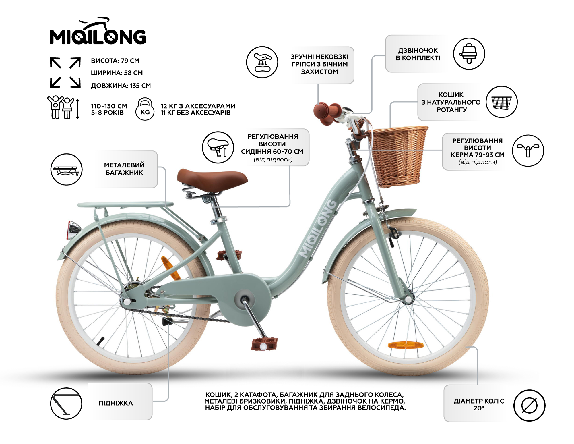 Велосипед для дітей Miqilong LS 20 - це втілення сучасного уявлення про ретро дизайн. Використання фарбування у стилі 50-х років ХХ століття та корзинки ручної роботи з натурального ротангу роблять дизайн велосипеда вишуканим та елегантним.