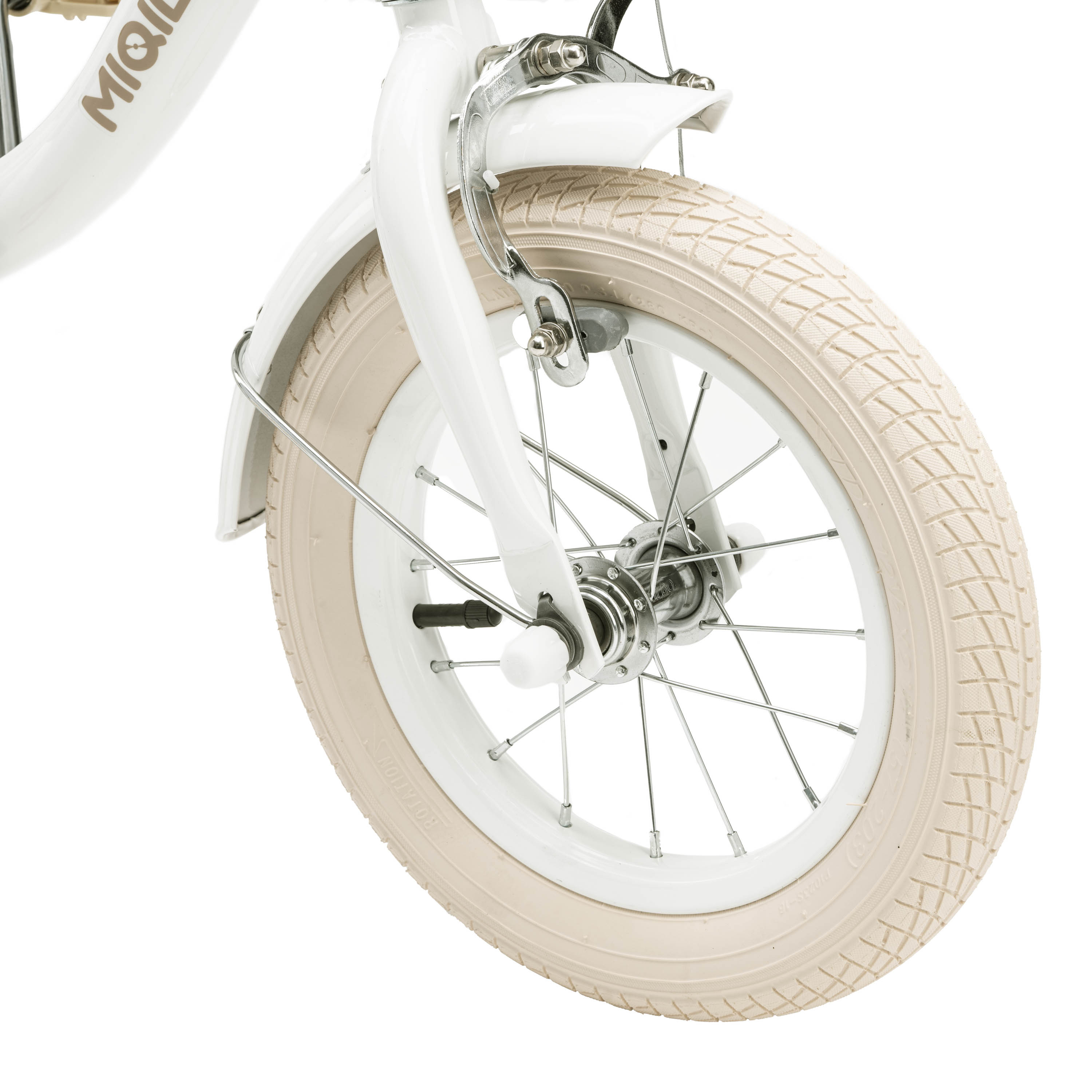 Диск колеса 12" традиційний, зі спицями та класичною втулкою на підшипниках. Високий та широкий профіль покришок забезпечить комфортну їзду як по асфальту, так і по нерівностям. Колеса додатково захищені металевими бризговиками, забарвленими у колір велосипеда. Вони надійно захистять від бруду і бризк.