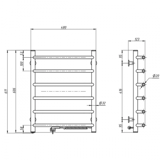 Технічні характеристики Рушникосушка Navin електрична Блюз, 600х480х123мм, кнопка, сталь, білий, праве підключення:
