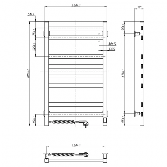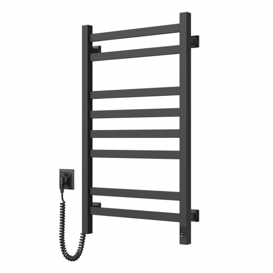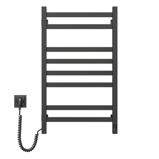 Електрична рушникосушарка HF Slim 1170х140. Працює за технологією сухого ТЕНу. Обладнана вбудованим таймер-регулятором і конектором для підключення до живлення з будь-якого боку. Оснащена комплектом для прихованого підключення. Модель має 2 ребера з круглої труби та стійки з квадратного профілю. Матеріал – чорна сталь з антикорозійною обробкою. Варіанти покриття: чорний мат або білий мат. Температурні режими таймер-регулятора: 40°С, 45°С, 50°С. Час роботи: 3, 6 годин або постійний нагрів. Потужність 80 Вт. Гарантія – 3 роки.