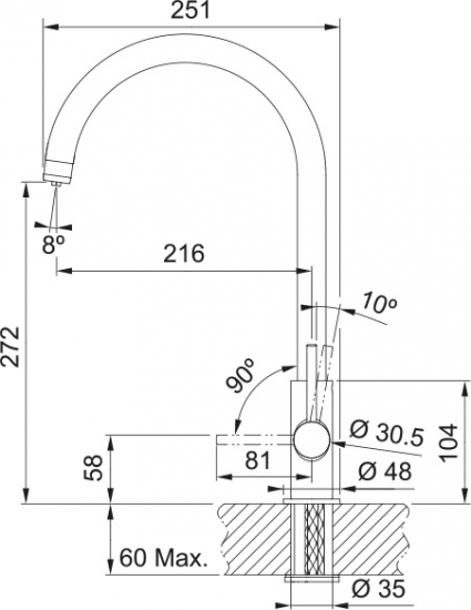 - Вилив: Довжина 272 мм, обертання 360°