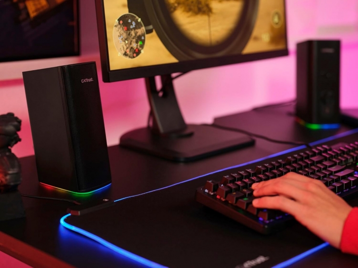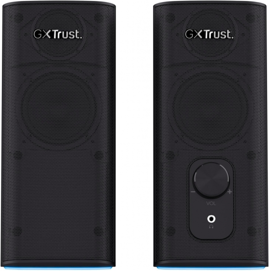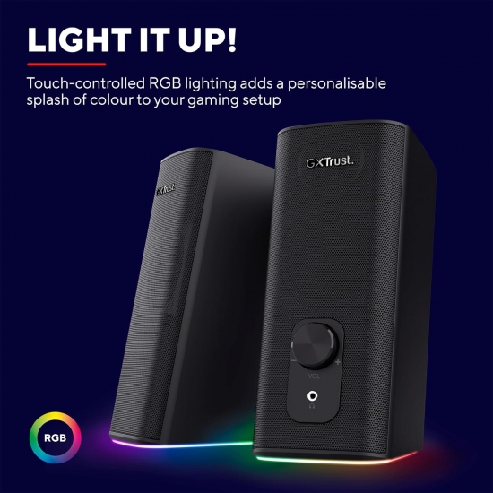 Trust GXT 612 Cetic — стильна 2.0 акустична система із Bluetooth, USB і AUX, виготовлена на 76 % із переробленого пластику. Забезпечує потужність до 18 Вт, має сенсорне RGB-підсвічування, USB-живлення — без розетки, прямо від ноутбука чи ПК. Зручна ручка регулювання гучності й роз'єм для навушників — стильне доповнення до ігор і фільмів