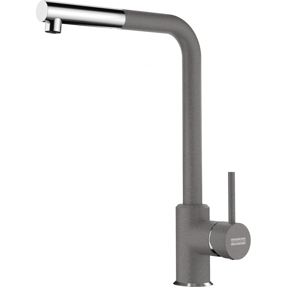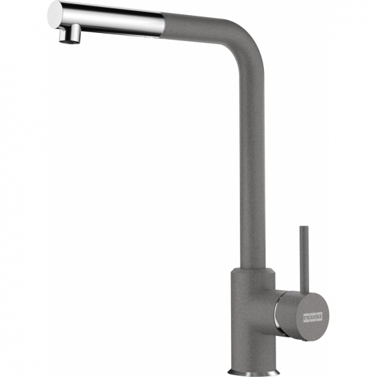 Franke Sirius Pull-Out L Shape — стильний і функціональний кухонний змішувач у виконанні хром + сірий камінь. Одноважільне керування і поворотний на 360° вилив забезпечують максимальну зручність при митті великих предметів. Унікальна функція — витяжний ручний душ (pull-out), який дозволяє точно спрямувати струмінь і полегшує очищення мийки.