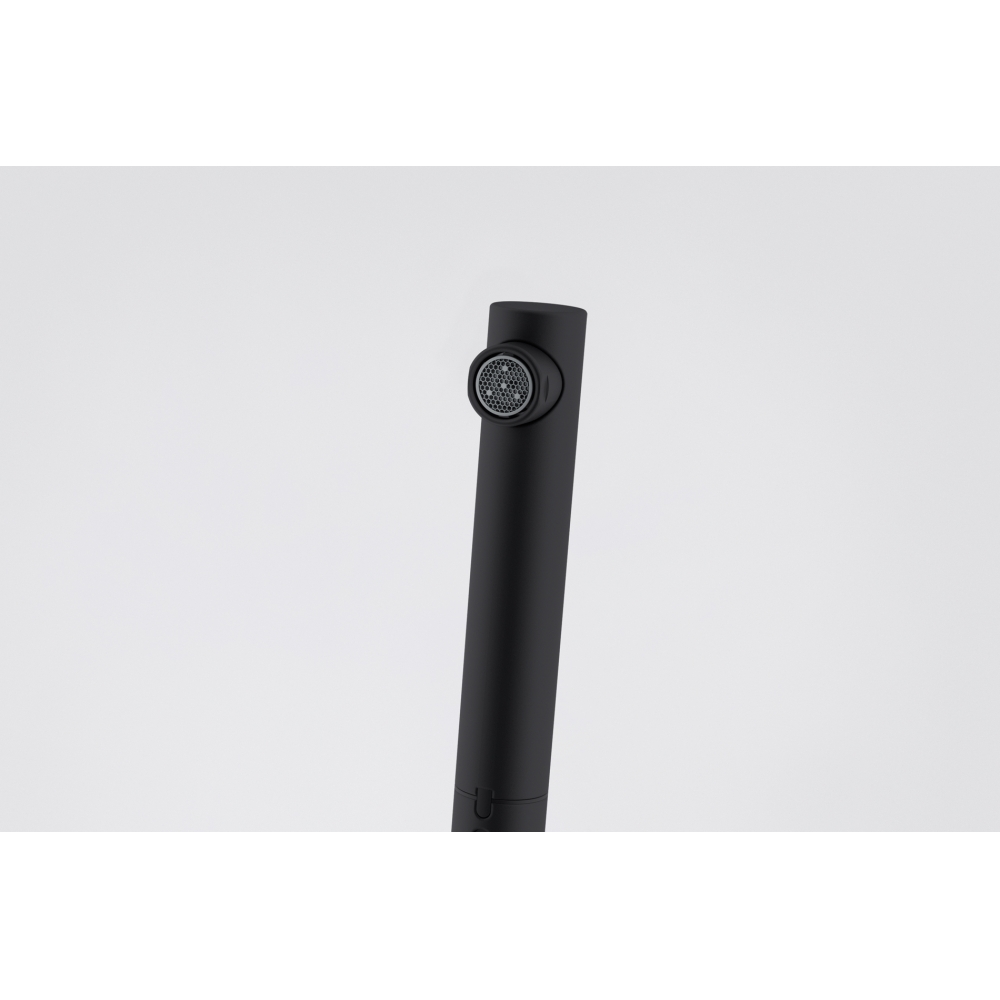 Franke Lina L Pull Out — дизайнерський змішувач у чорному матовому кольорі, виготовлений зі зносостійкої латуні. Має витяжний шланг з нейлону 1,5 м і L‑образний вилив довжиною 254 мм, що забезпечує зручність миття. Висота корпусу становить близько 285 мм, повний оберт на 360°, одноважільне керування та вбудований honeycomb- аератор, що пом'якшує струмінь без надлишкового бризкання