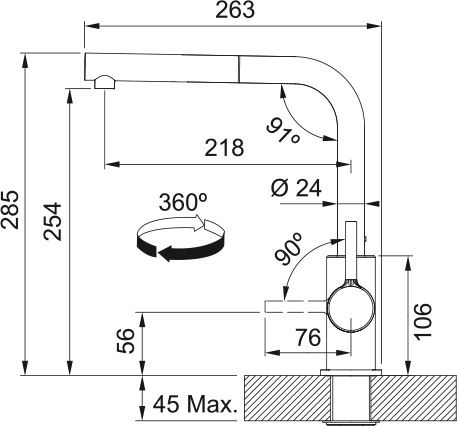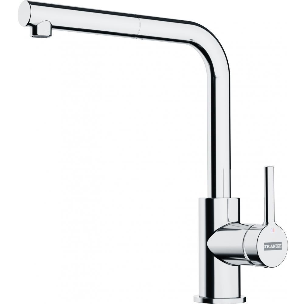 Franke Lina L Pull Out — дизайнерський змішувач у хромовому кольорі, виготовлений зі зносостійкої латуні. Має витяжний шланг з нейлону 1,5 м і L‑образний вилив довжиною 254 мм, що забезпечує зручність миття. Висота корпусу становить близько 285 мм, повний оберт на 360°, одноважільне керування та вбудований honeycomb- аератор, що пом'якшує струмінь без надлишкового бризкання