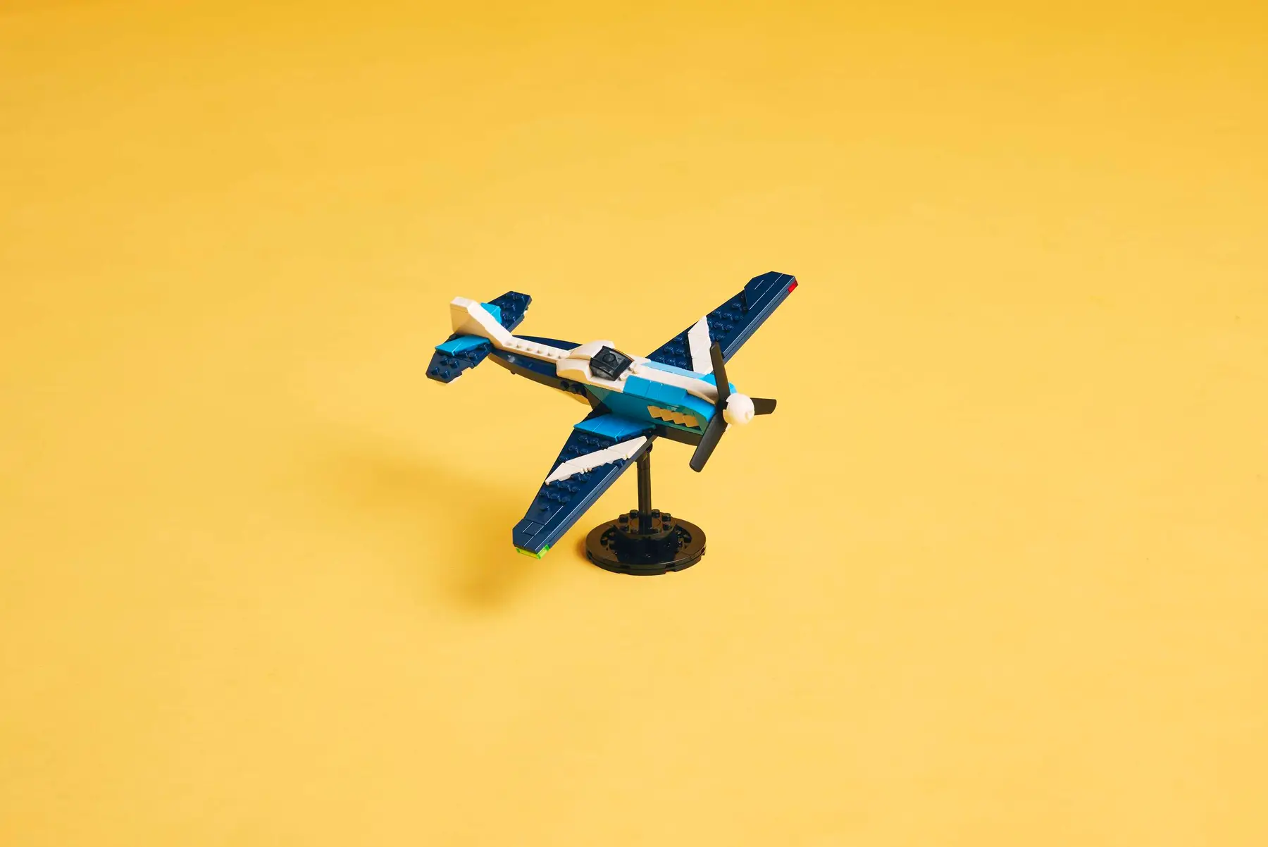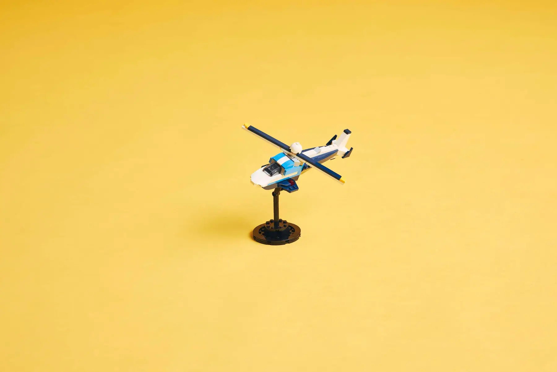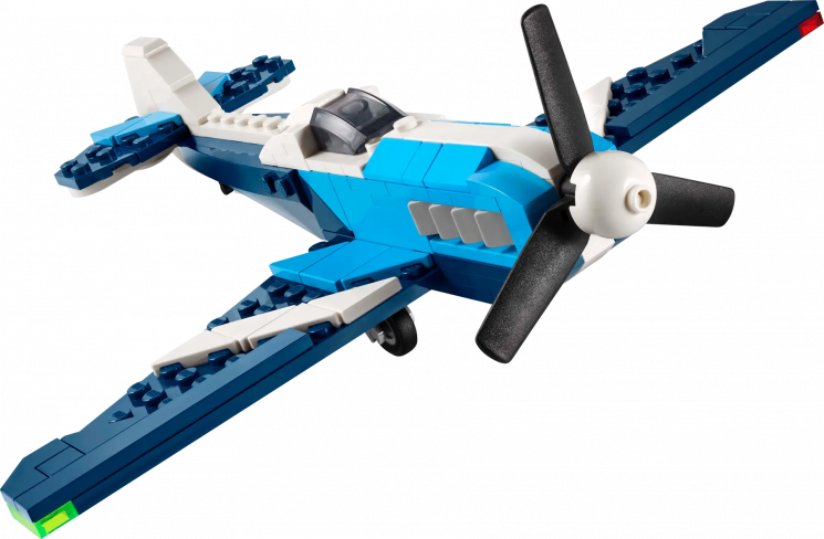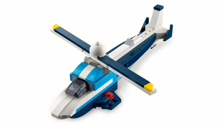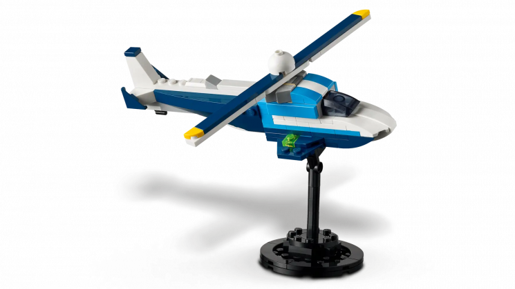 Діти можуть зібрати 3 різних чудових транспортних засоби: іграшковий літак з пропелером, що обертається, і рухомими колесами; реактивний літак з рухомими колесами й модель вертольота з лопатями ротора, що обертаються. Кожну модель можна розмістити на підставці з кубиків, а набір стане чудовим подарунком дітям, які обожнюють розігрувати творчі гостросюжетні історії.