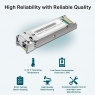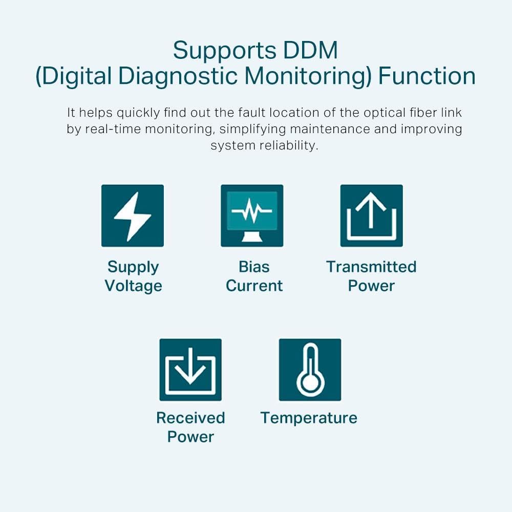 Модуль відповідає стандарту SFP‑MSA, сумісний із пристроями TP‑LINK (маршрутизаторами, комутаторами, медіаконверторами MC220L) та обладнанням інших виробників. Він підтримує DDM (Digital Diagnostic Monitoring), що дозволяє спостерігати поточні параметри (температуру, потужність Tx/Rx, струм) в режимі реального часу.