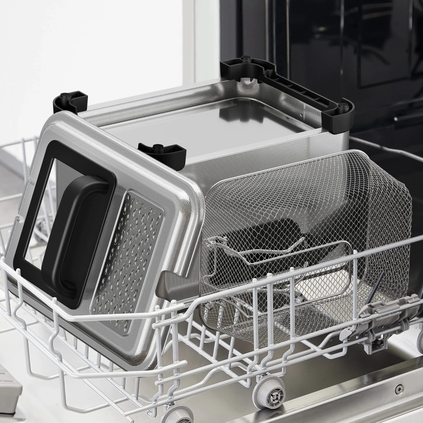 Проста у використанні й придатна до миття в посудомийній машині. Сітка залишається всередині чаші навіть під час смаження.