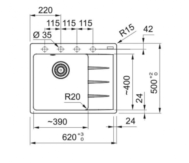 Особливості товару Мийка кухонна Franke Centro, фраграніт, прямокутник, з крилом, 620х500х200мм, чаша - 1, врізна, CNG 611-62 TL, чорний матовий
